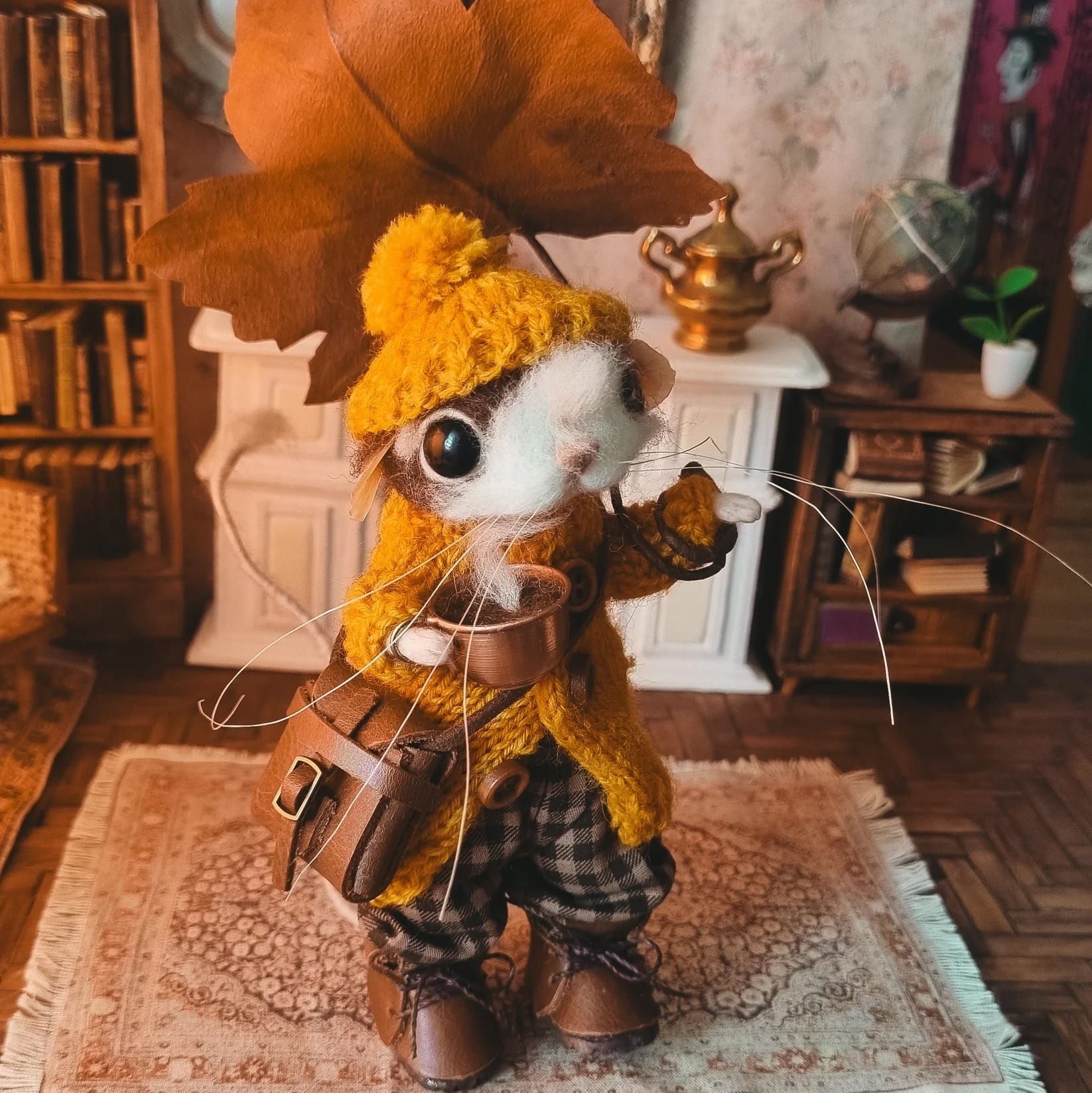 Kel’s process begins with her selecting 100 percent natural wool, which is purchased from a local farm and dyed with organic dyes, showing her commitment to a sustainable art-making process. She then creates a wire armature that will allow her mice to stand up and have poseable articulated limbs. She uses the wool she had sourced to sculpt each mouse with a needle felting technique, where she uses a special barbed needle to tangle and shape the wool fibres. Finally, she creates clothing and wearable accessories for her mice from wool yarn, cotton fabric, satin ribbon, cotton lace and thrifted leather scraps. Whenever she has to create small miniature items for her mice, such as lanterns, tables, etc, she makes them by hand and paints them herself. Copper miniature kitchen wares, such as teapots and pans, are sourced from small local businesses.