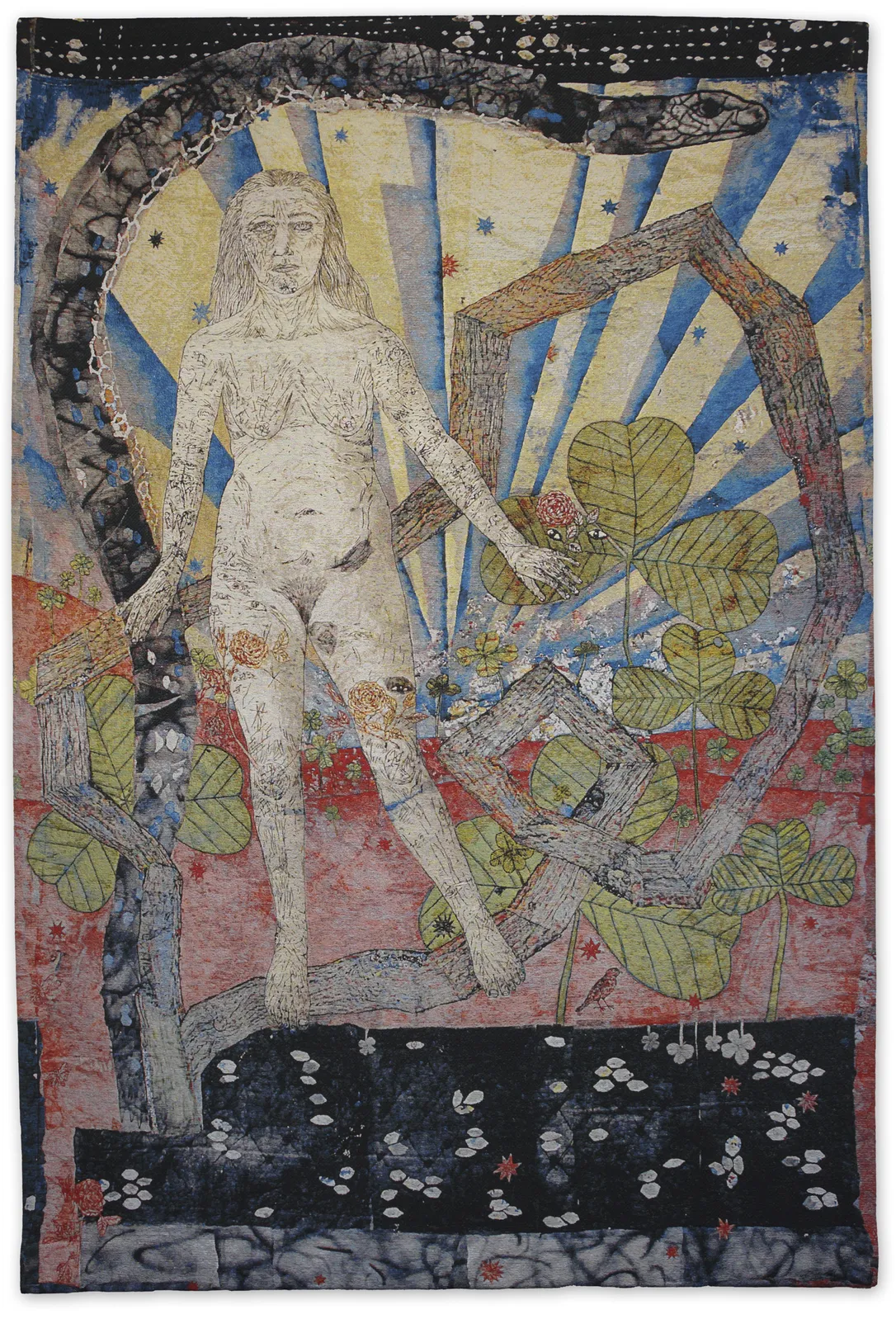 The Malmö exhibition offers a rare look at the artist’s evolution, exposing the way an idea matures over time. There, audiences see how Smith often revisits the taxidermy drawings she made in 1994, collaging and chopping them into new configurations. This process is most evident in her monumental Jacquard tapestries, such as Earth. These works are born from a fusion of ancient textile tradition and modern technology, as Smith works with computerized looms, painting on digital prints and scanning them back into the system to create pieces that are at once technologically precise and aesthetically amorphous.