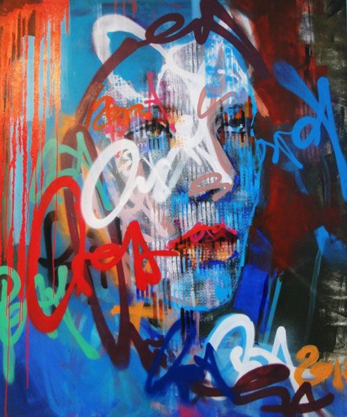The South African artist, Kilmany-Jo Liversage, works her magic on large canvases with bright colours. She reports Renaissance portraits as a big source of inspiration. Her works boast interplay between figure and ground. The figures are brightly lit with the same drama and poses of Renaissance women without the finery and expensive furnishings that were common at the time. Now, their colourful backgrounds contrast or occasionally envelope the subjects in graffiti tags.