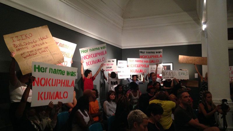 Apart from the continued support and success Mthethwa enjoyed while on bail, real outrage sparked when his work was shown in 2016 in the 16 Days of Activism exhibit at the South African National Gallery, which aimed to raise awareness for abuse against women and children. Here, she participated along with SWEAT (Sex Workers Education & Advocacy Taskforce) to have his works removed from the exhibit and to call for justice for Kumalo.