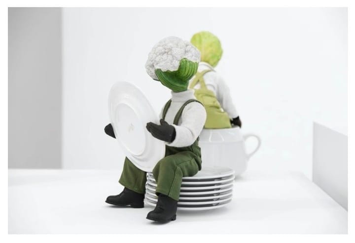 Les Famille Des Hybridus was a solo exhibition by established French artist Jean-François Fourtou, where he showcased a series of sculptures called Nanitos and Minitos. The series of works, which come in small, mini and medium sizes, portray a family of blue-collar workers with various agricultural products as their heads. This includes a pumpkin sweeping the floors, a cauliflower drying the dishes and a radish carrying kitchen utensils as if getting ready to set the table at a restaurant.