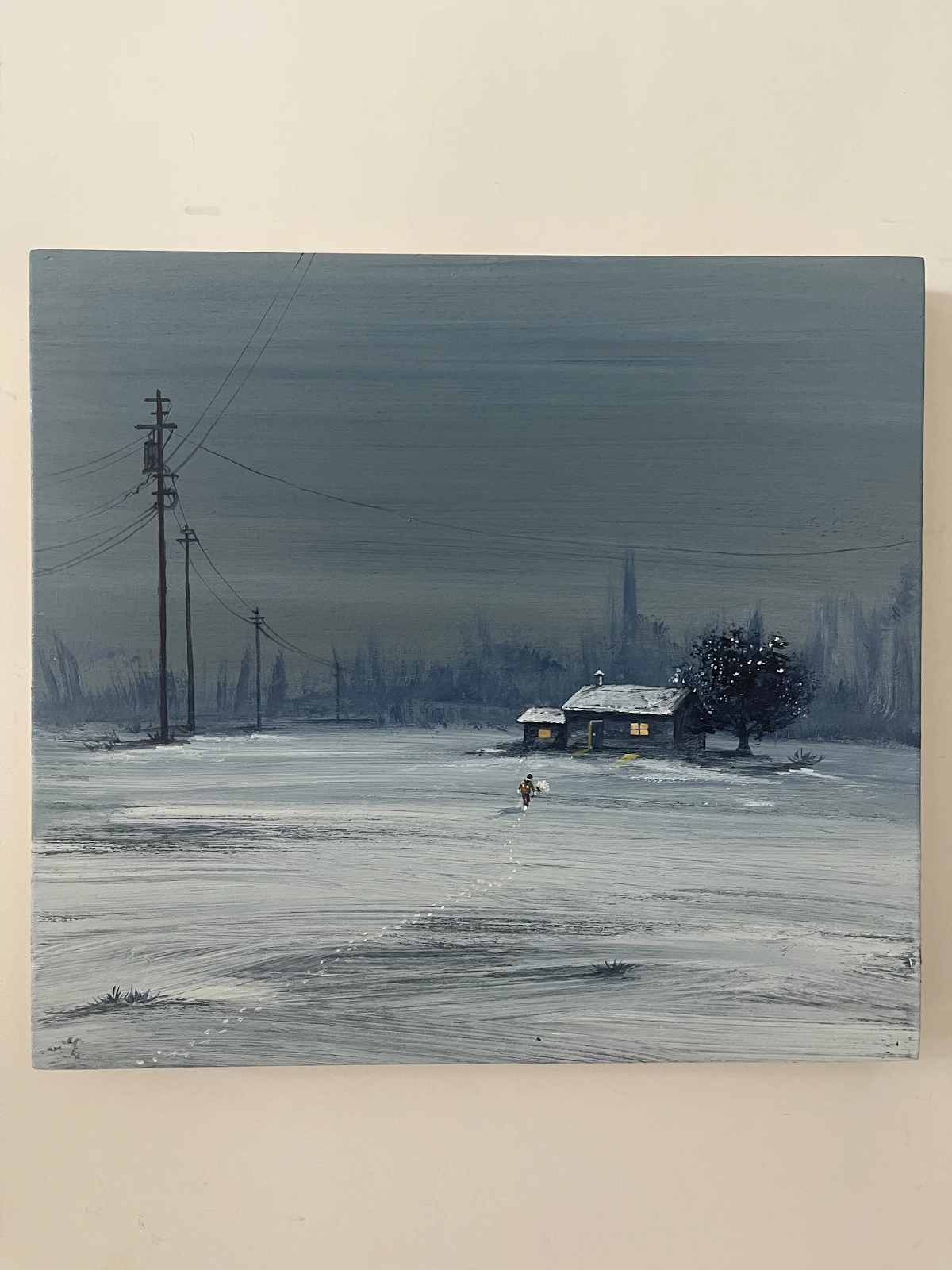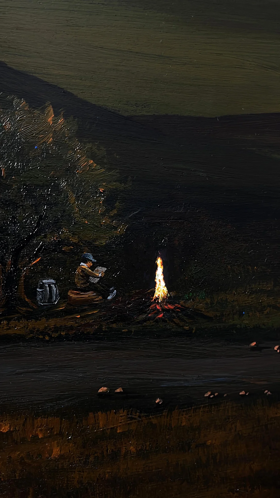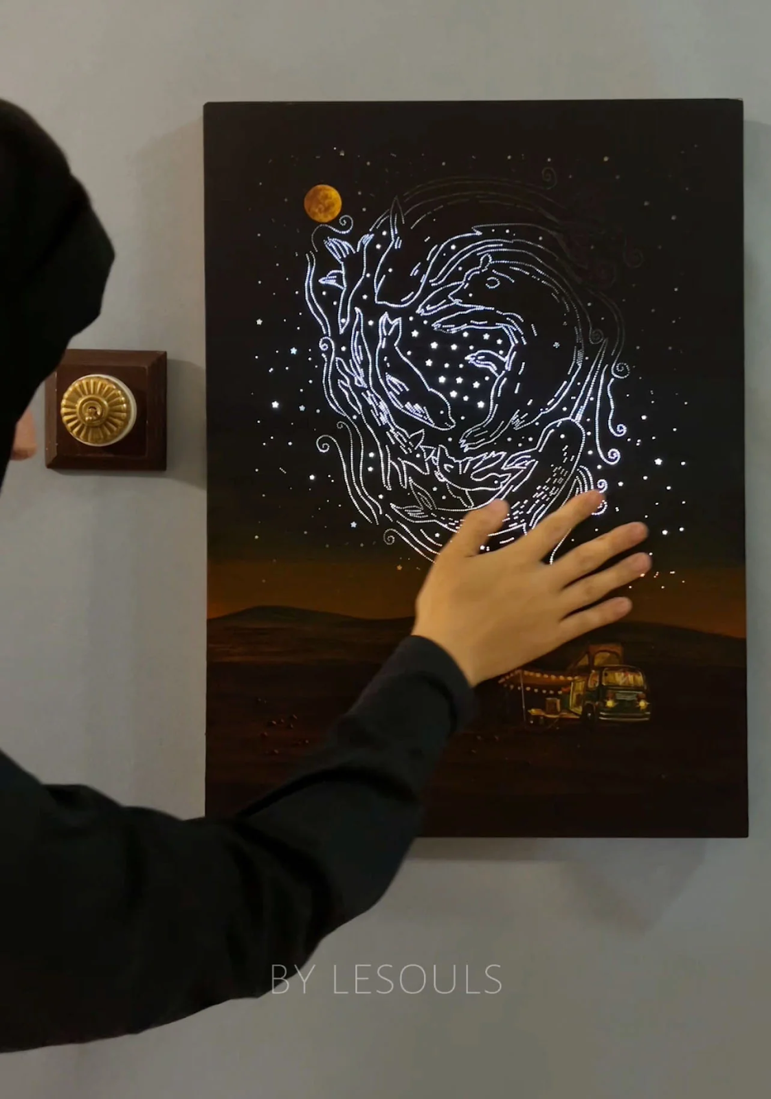 For example, their painting Bonfire Boy shows a wide-open natural panorama at dusk. In signature Lesouls fashion, the sights look serene, with rolling mountains and grasslands swaying in the wind. In the painting's foreground, a single boy sits reading by the light of a bonfire. Lesouls has embedded a touch-sensitive lightbulb in the canvas. When talking about the piece, they ask their audiences to “Touch the bonfire gently with your hand,” so that the bonfire will light up the painting. This simple act brings joy and wonder to their viewers. It reminds them of the grand impact that the seemingly simple and human act of lighting a bonfire can have on the environment. It cautions people of the snowball effect that their daily decisions have made and will make on the environment.