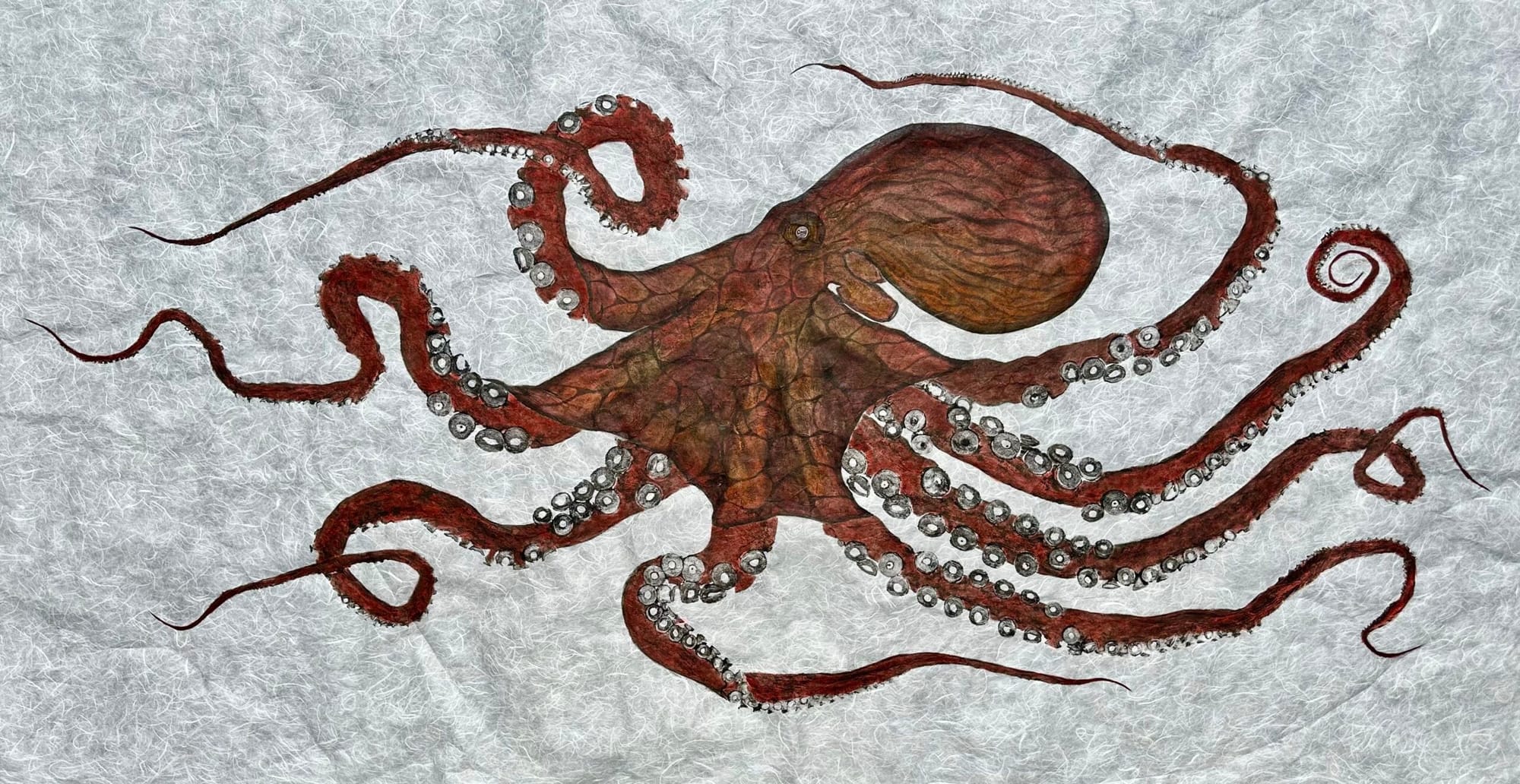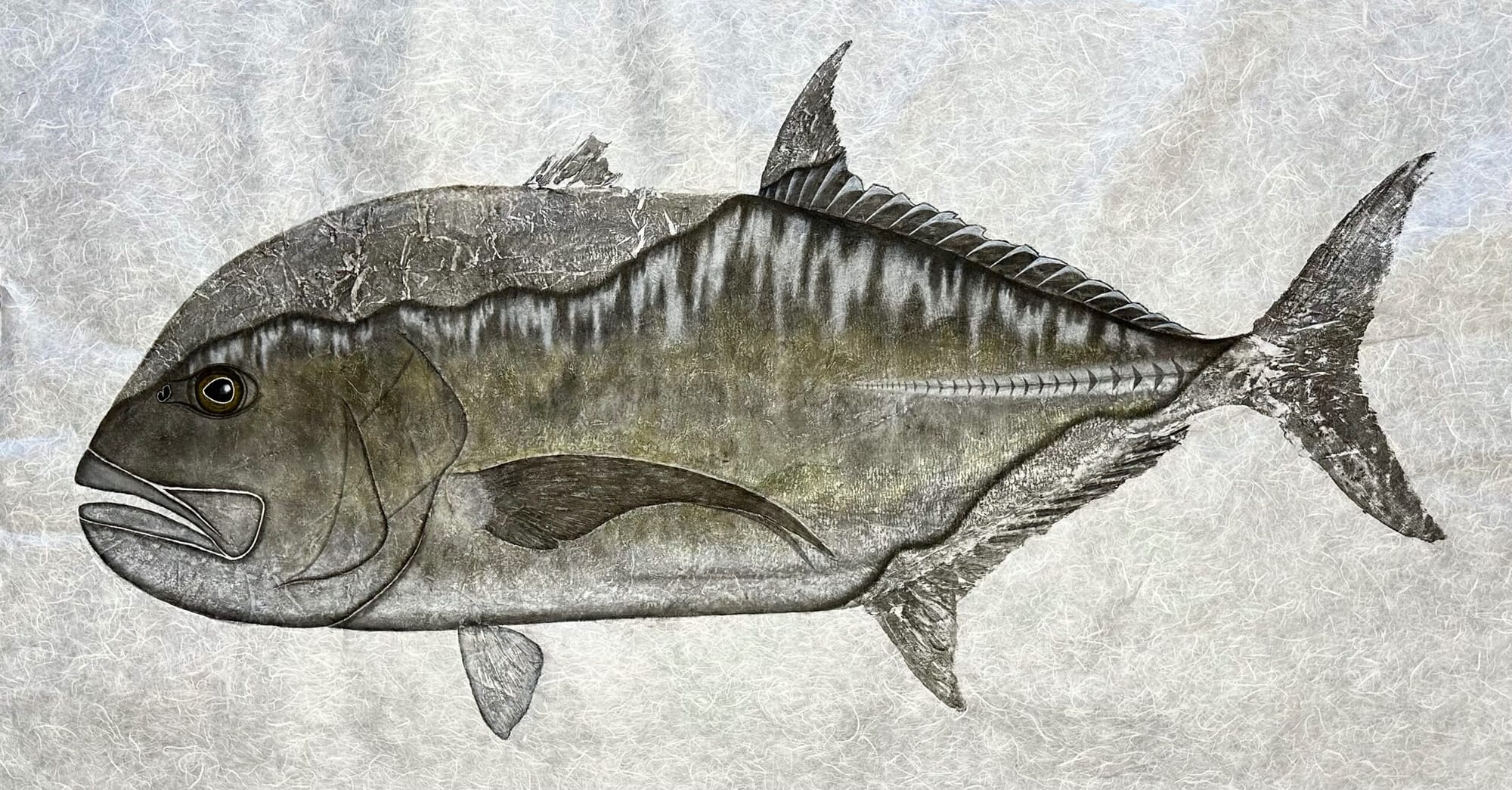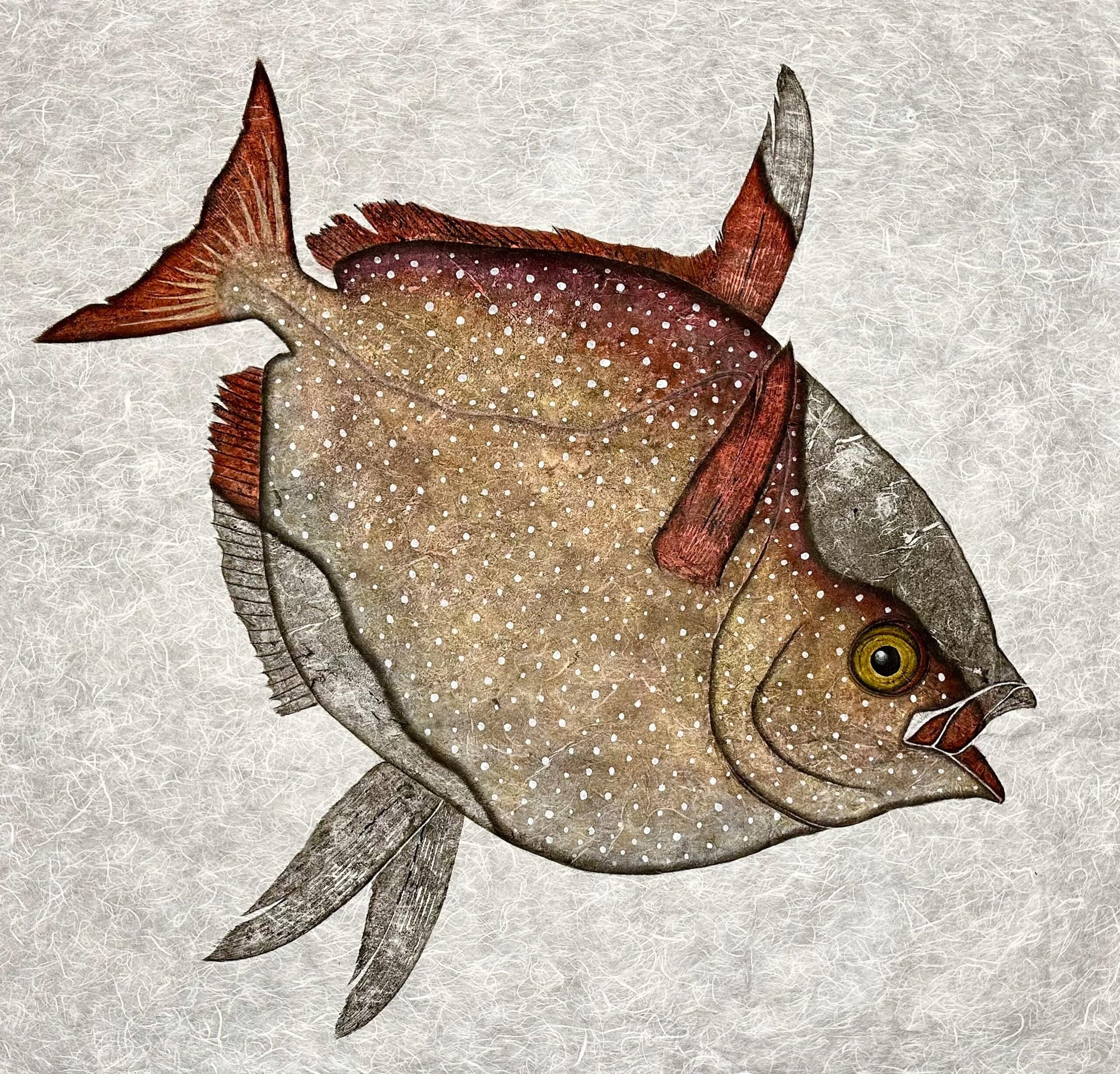 “Makai” comes from Hawai’i and translates as “by the sea.” Nonaka labelled his work “Impressions from by the Sea” as the perfect way to encapsulate how his prints capture raw and unfiltered marine life from his home in Hawai’i. Brandon was born and raised in Hilo, Hawai’i a small quiet town where he spent most of his childhood with his avid fisherman father. He considers fishing, spear-diving and various ocean activities a common part of childhood in Hawai’i. After he was introduced to Gyotaku, he saw it as the perfect way to preserve marine life and fond memories of life in Hawai’i forever.