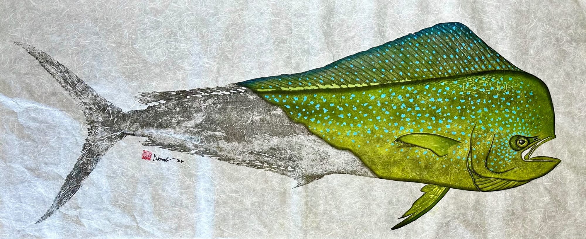 The Gyotaku process begins when an artist applies black ink directly onto freshly caught fish. The excess ink is then dabbed off to ensure a detailed image of the fish can be transferred onto rice paper like a stamp. Ideally, this image should also capture the fish’s scales and textures. Nonaka also practices a somewhat modern iteration of the technique where acrylic colours bring the initial black-and-white print to life. This will allow the artist to capture everything from the fish’s eyes to colourful details such as stripes, spots and patterns. Each Gyotaku piece is only considered finished when its artist adds their Hanko to the piece; these are hand-crafted stamps that function as signatures in Japan.