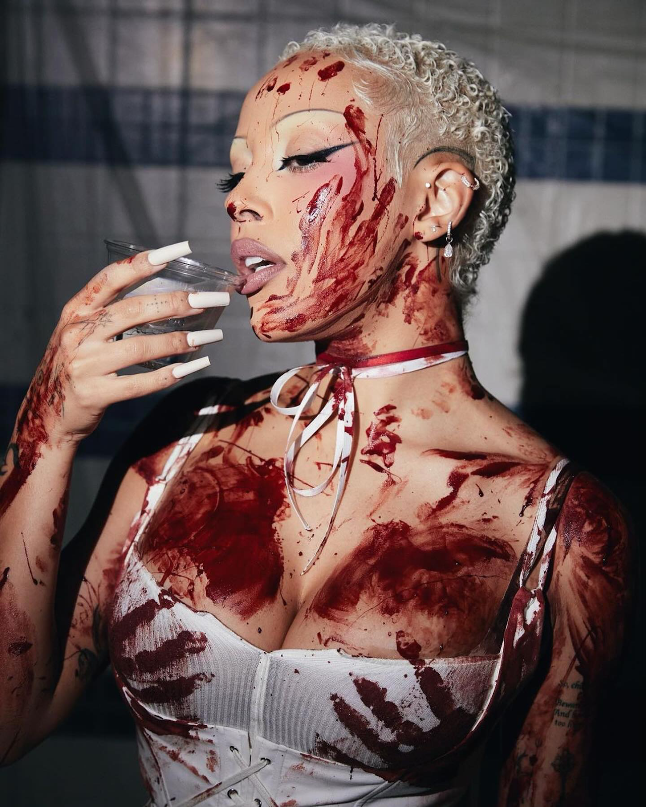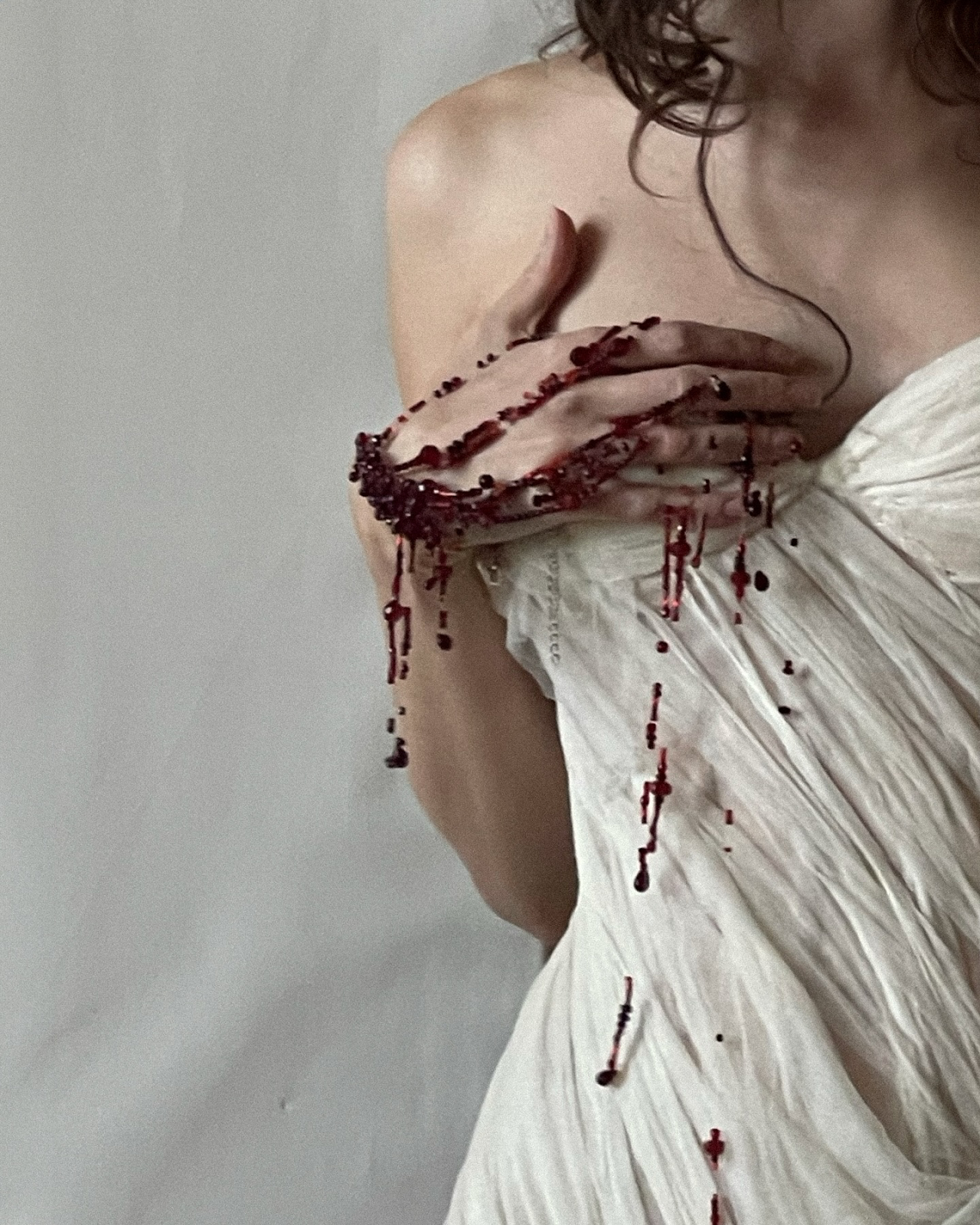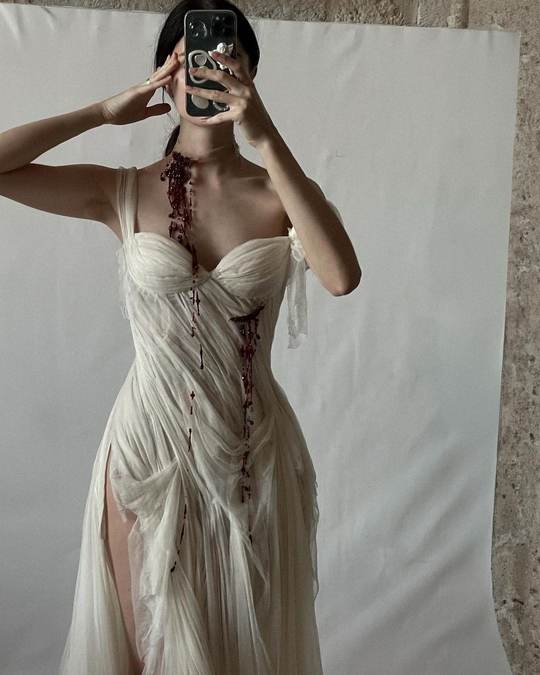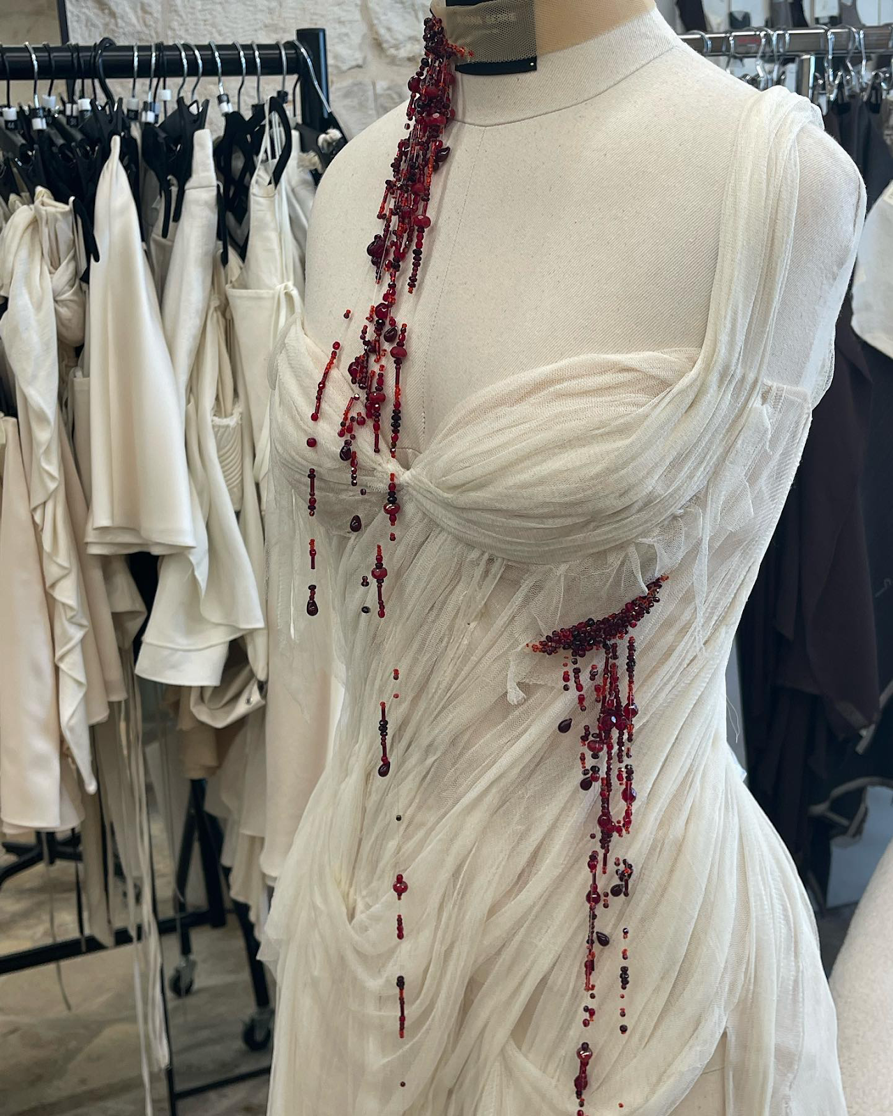 Italian based slow fashion brand, MARINA EERIE, has been known for its romantic and hyper-feminine couture gowns. Their style takes inspiration from historical fashion such as Victorian and Ancient Roman style. Lately, the brand has been known to also churn out custom pieces that embody the “Bloody Bride” archetype, where a bride’s iconic white dress is intertwined with red embroidery and beading to intentionally resemble dripping blood.