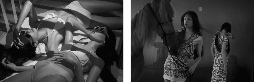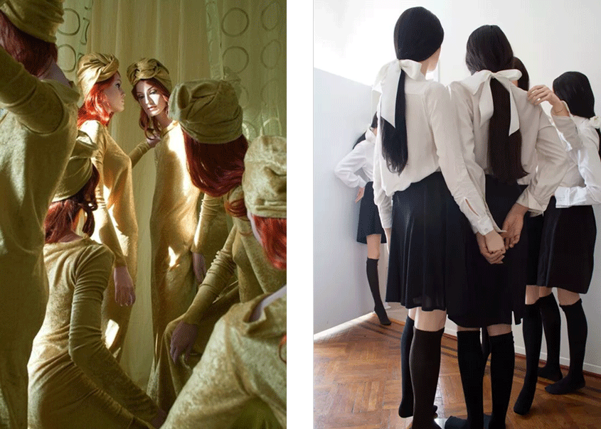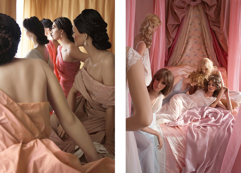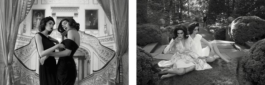 In the Girl Friends (2014) series, Gutierrez juxtaposes herself and a mannequin staged to appear as Hollywood film stills of two starlets in intimate black and white images. In contrast to the Girl Friends series where there is only a juxtaposition between Gutierrez and a mannequin, the Line Up (2014) series features Gutierrez receding and assimilating into a group of mannequins. In this series, the artificial not only dominates the real but erodes the ability to easily recognize the real.