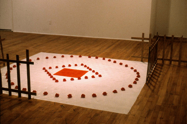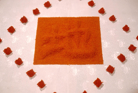 Once again, Wong used dyed rice as the main medium to spell the Chinese character for ground, 地, on the white silk pasted to the floor as a garden space. By using Chinese characters, Wong adds nuance and double meanings that would mean different messages for different audiences.