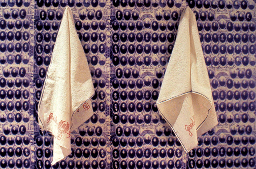Wong also included towels that are commonly used in Hong Kong in her installation. On one side of the towel, it says “Good morning” in English and on the other side, it says “Wishing you a Good Morning” in Chinese. “I wanted to think about what it means for a Chinese person to buy and display them versus white people,” Wong said.