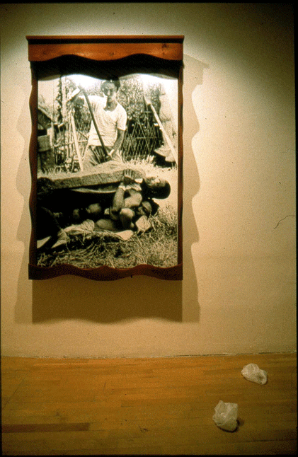 There are two letters on the wall, one she wrote as a child in Chinese and one she wished she wrote, but now in English. Wong wrote about her desire for safety and pain, juxtaposing her experience because her father was not there against the image of him within the bed frame as a strong man.