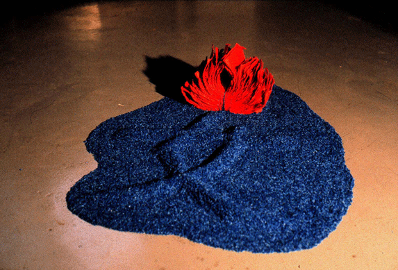 Using handmade paper and dyed rice, Wong wanted to use symbolic meanings and visuals to highlight the exoticization of women, especially in the Western world. She wrote the word “woman” in Chinese, 女, with the dyed blue rice shaped like a pool with the origami lily flower at the head.