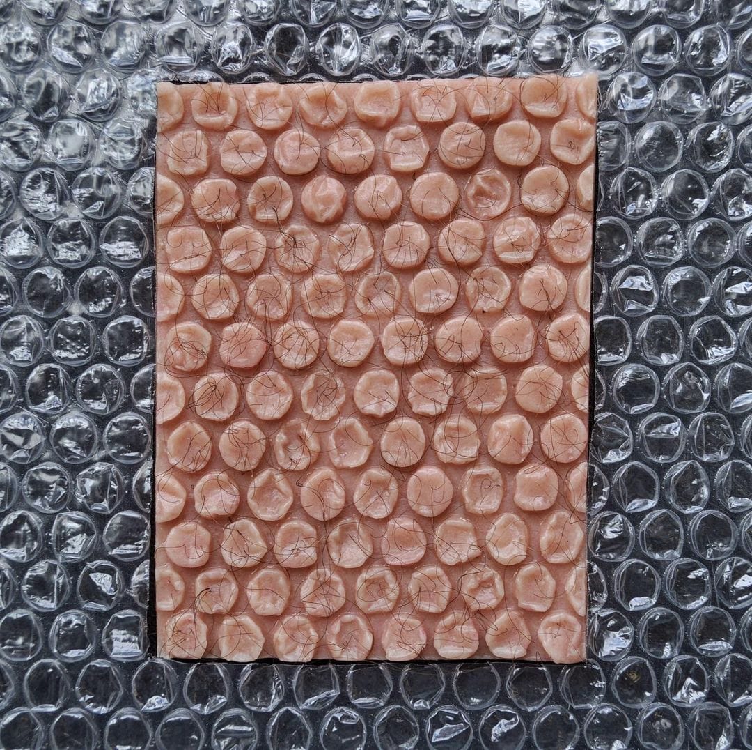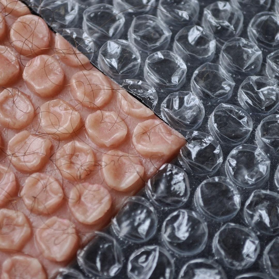 In works by Brussels based Matteo Ingrao, everything from bubble wraps to shower handles have been made from human body parts—silicone moulded to resemble human parts. These terrifying sculptures request people to think about the impact that these consumer goods are having on the human body. They recall how microplastics and carcinogens are present in everyday household items, affecting people’s health without them realizing.