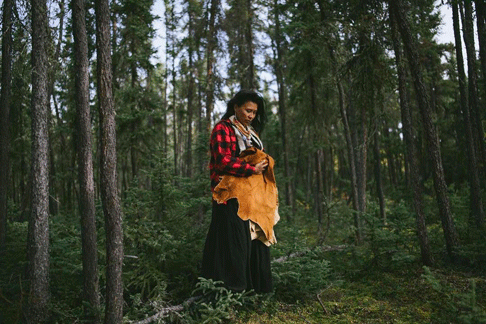 Artist, actress, mother, and hide tanner, Melaw Nakehk’o is a conduit to the past, using her art to connect her community to the rich cultural heritage handed down by her ancestors. Nakehk’o is Dene and hails from Łı́ı́dlı̨ı̨ Kų́ę́ (Fort Simpson, Northwest Territories). According to her blog, she was taught to bead and sew by her “Granny,” and now works with the elders in her community to pass on knowledge and stories to the next generation through an organization she co-founded, called Dene Nahjo.
