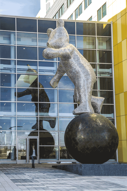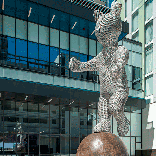 Despite its still structure, Petit Frere, Bear & Planet appears to gesture and wave to the people who visit it. Perhaps the bear is actually waving to the surrounding stars and planets it greets on its cosmic adventure. Whatever the story, Bear & Planet inspires the imagination of its viewer. The changing environmental conditions that encircle Petit Frere, Bear & Planet add a further dimension to the artwork’s creative vision. At night, the structure’s configuration of LED lights glow, and visitors get a glimpse at the blue illumination peaking through the body of the sculpture. Given its location next to a hotel, Petit Frere, Bear & Planet welcomes everchanging and transient viewers. For the artist Michel Saulnier, the bear is an animal that symbolizes positivity and protection. The bear is also a motif that frequently appears throughout his practice. As the title would suggest, Petit Frere, Bear & Planet is like a little brother to other works Saulnier has created. Bear is a friend watching over Downtown Markham’s visitors –– an image of strength and protection. At the same time, the sculpture, Petit Frere, Bear & Planet, provides adults, parents, and children alike with the courage to step outside of their reality and raise their imagination.