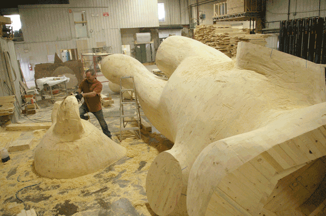 I came here, to my village, to learn about wood, but whenever I have the opportunity to make public artworks, I am always asked to make a work that will continue in the future or one that will last. I had to find other materials. Like, aluminum. It is a nice medium. I found this technique where I create the masterwork in wood, and then I shape the form in aluminum. For me, this material was a good compromise. Also, I work with steel brass, like in Petit Frere, Bear & Planet in Downtown Markham, the material of the planet, the ball. I like aluminum and brass; they are my best materials because they are easy to shape and weld. For Petit Frere, Bear & Planet, the bear’s material is this kind of aluminum used to make airplanes. It’s a very light material and very strong. So, we found it, and we tried to shape the form of the bear. It worked well, and I will certainly use it again. It's actually better for the work’s engineering because the wind and light can pass through the bear.