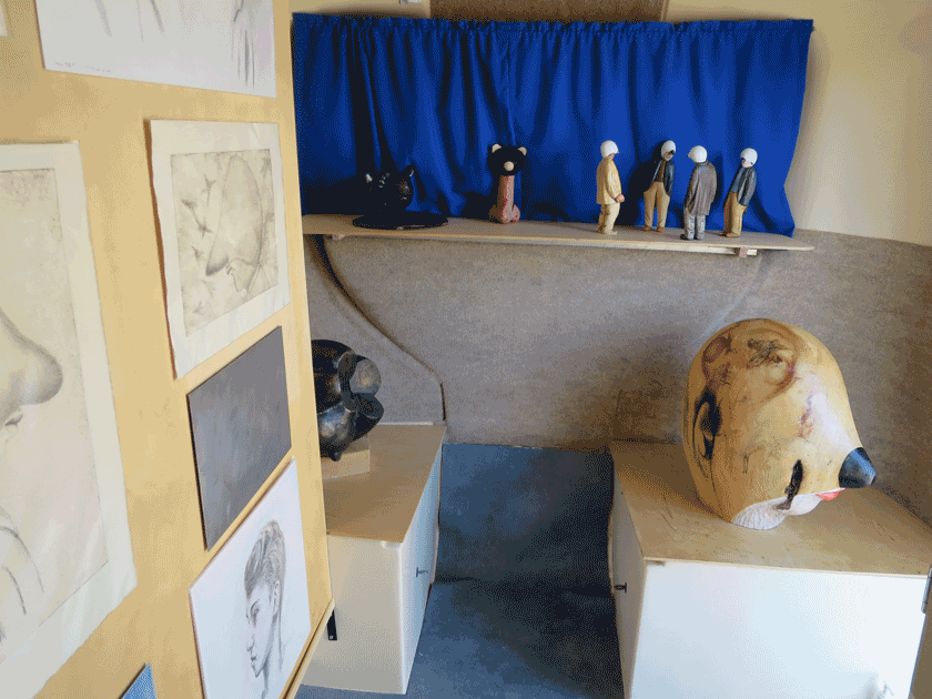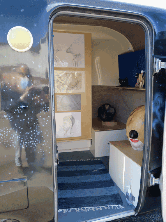 The Art Mobile Project was a very simple idea. I realized last summer with the COVID-19 pandemic that I had fewer projects to work on. I decided to make my little house into a space that could travel and be used for exhibitions. I made a series of small wooden figures with head masks. The inspiration for the mask came from the Plague Masks used by doctors in the middle ages. This work was made in relation to the COVID-19 pandemic and also to these small wood characters that are a tradition that we have here in this village. Essentially every small shop sells these characters. The exhibit became popular, and people started to buy my sculptures. Also, there is a new funding program that I applied for to help diffuse art into the community during this time. I asked for the funding of the program, and I got a yes for an answer. I organized six workshops for youth. The contact is perfect. I got to go to small villages where people have never seen contemporary art. They are so happy about art and open to art.
