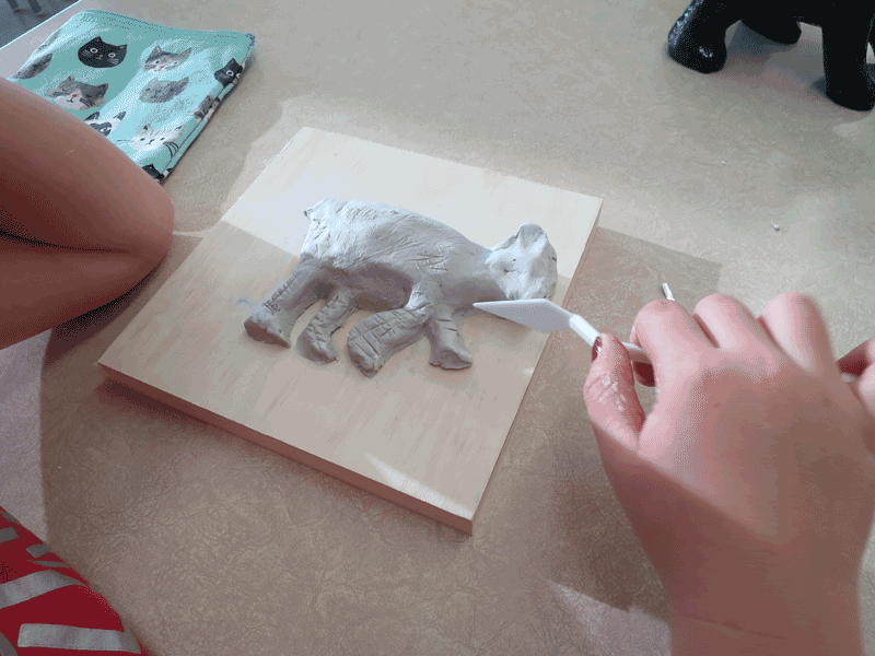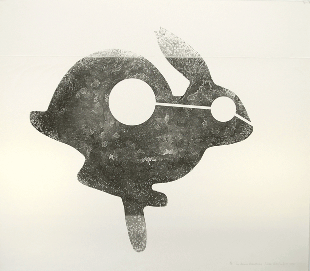 I prefer press print. I use an aluminum plate, and I engrave it with electric tools, the same ones that I would use for wood. In this sense, it is not very orthodox. For the rest of the process, I use a reel press big enough for this scale (the bear is 5 feet long). In my printmaking, I always keep an influence from works of sculpture.