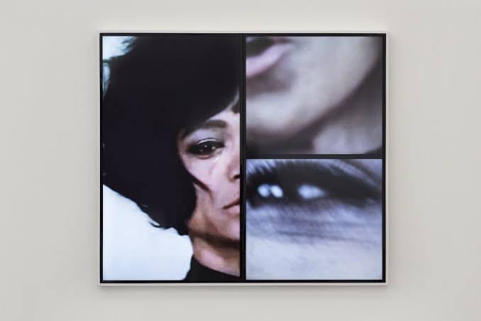 The imposition of the different videos being spliced together in Angelitos Negros #1 creates a fragmented yet holistic image of Eartha Kitt. When combined, the footage highlights some of Kitt's features, such as her eyes and mouth. Even if this is fictional footage of Eartha Kitt made by Thomas and her performers, this act symbolizes Thomas’ wish to create an in-depth portrait of Kitt; one that can capture her many layers as a public figure, inspiration and human being. Thomas is no stranger to employing fragmented images to create in-depth portraits. A similar technique can also be found in Thomas’ series of paintings of other renowned Black women actresses. These are figures such as Diahann Carroll, Naomi Sims and Pam Grier, who have epitomized the Black is Beautiful movement in Hollywood cinema during the 1960s - 70s.