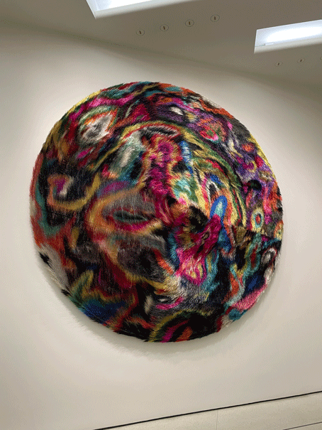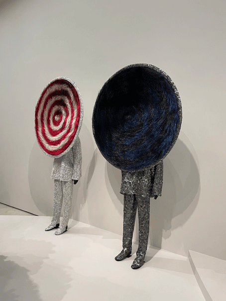 The exhibition’s second chapter, featured on its own level within the Guggenheim takes a different approach. Rather than displaying the whimsy and vibrancy of Cave’s earliest works that highlight flamboyance and pageantry experienced in his early life in Chicago, “What It Is” addresses darker issues surrounding his artwork.