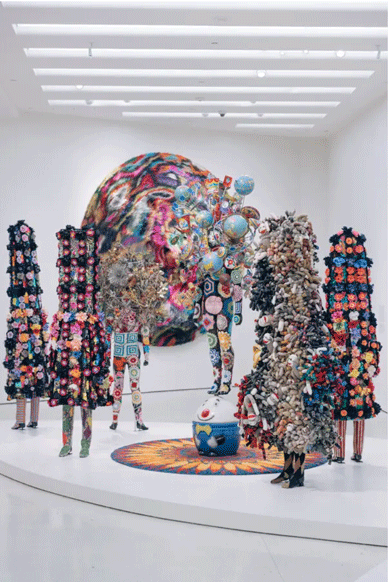 On display at the Solomon R. Guggenheim Museum in New York City from Nov. 2022 to April 2023, Nick Cave: Forothermore is the first survey bringing together works across the artist’s three-decade long career. Showcasing his “unusual ability to upend and confound common senses of value” through displays of his commonly utilized discarded and “kitschy” items, Forothermore explores Cave’s influences from the design philosophy of the Bauhaus School to the Arte Povera postwar era elevating mundane objects to fine art and to the “creative frugality” of his upbring and family.