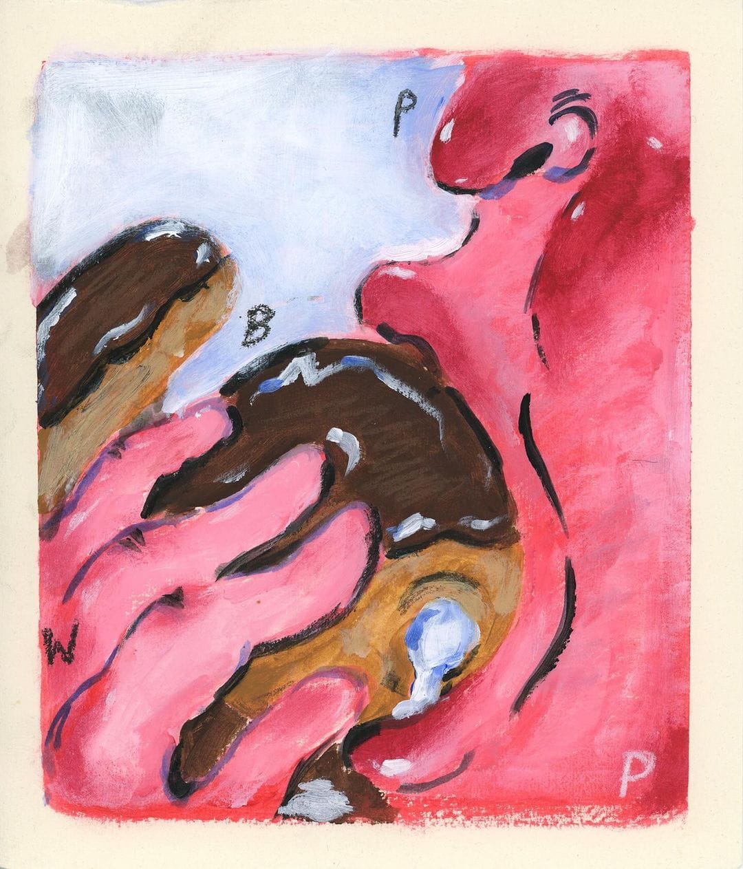 British artist Olivia Sterling paints all sorts of bodies having fun with food. These bodies, whether slim or fat, black, brown, or white, masculine, feminine, or intersex, are all consuming and lathering themselves in cakes and chocolates without a care in the world. On the surface, these paintings can easily be read as a celebration of having a positive body image and a healthy relationship with food.