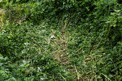 As viewers, there is not much to ground us; Baumgarten intentionally avoids contextualizing the photographs. We are instead left face-to-face with the images - forced to ask our own questions and to engage with the discomfort that we feel. A simple photo of matted grass provokes a search for answers: Who was once here? What were they doing? Where are they now, and are they okay?