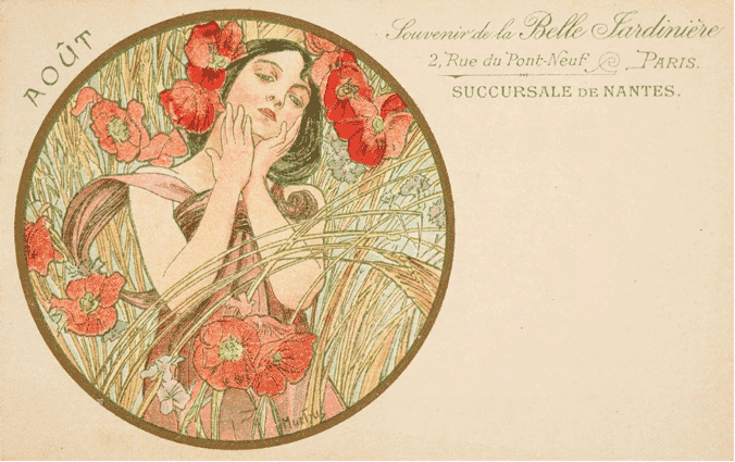 When Art Nouveau was at its height in 1890-1910, postcard design embraced the modernity of this new style. The postcard designs of this time disregarded symmetry and instead utilized curves and natural lines, drawing inspiration from nature and plants, often using women, particularly oriental women or women from ancient art as the main subject.