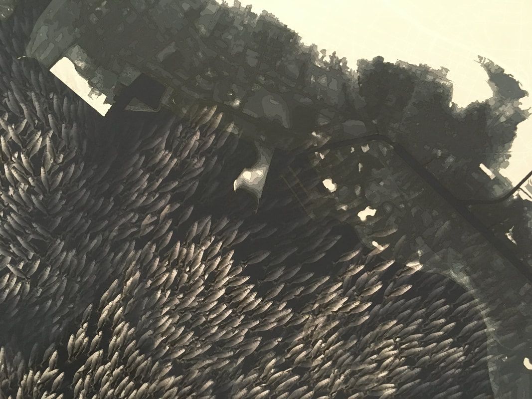 On the other hand, Kaili Chun’s HŪ MAI, ALA MAI invokes Hawaii’s not-so-distant future: the collages feature projected shorelines in Waikīkī (bottom), Honolulu airport (middle), and Marine Corps Base Hawaii’s Kāneʻohe Bay (top). Chun draws heavily from the past, using schools of ‘o‘opo, awa (milkfish), and ‘ama‘ama (mullet) to illustrate how Hawaii’s past may soon become its future.