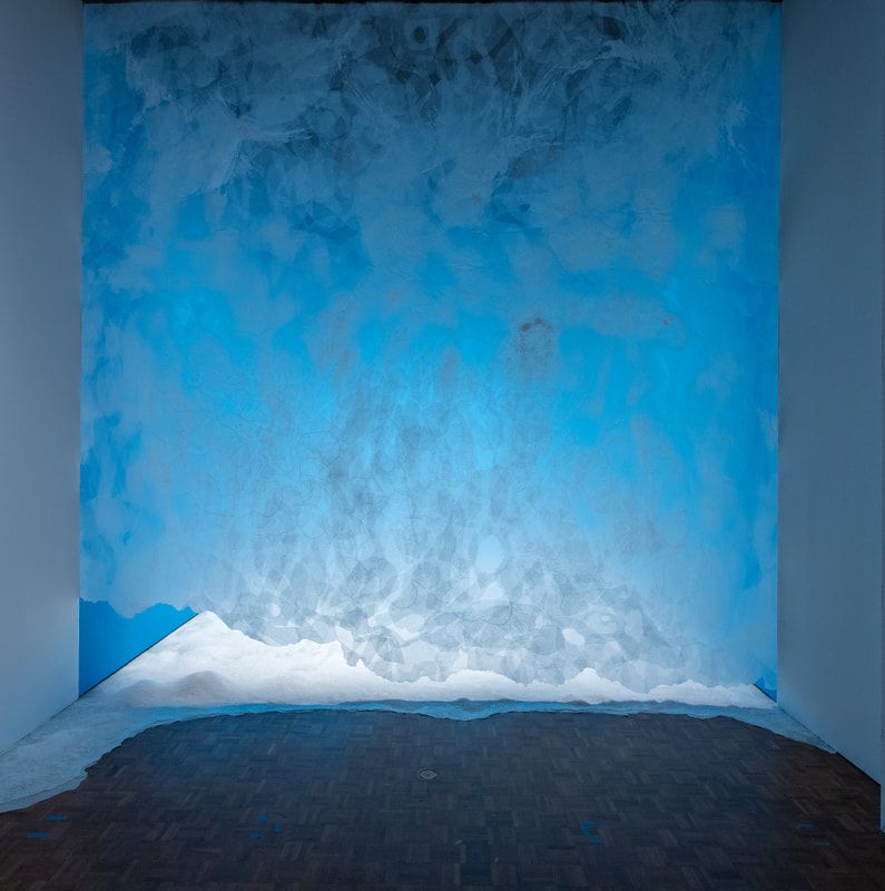 While the term inundation means “an overwhelming abundance,” INUNDATION refers to “both the watery disasters of climate change and the overwhelming emotions they evoke.” Mary Babcock’s Lotic Sea is a reference to freshwater melt in Greenland and Antarctica. Constructed from wax paper and set against blue lights, the viewer drifts between images of melting ice and rising sea levels.
