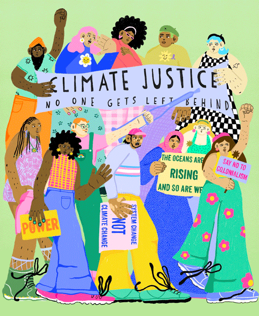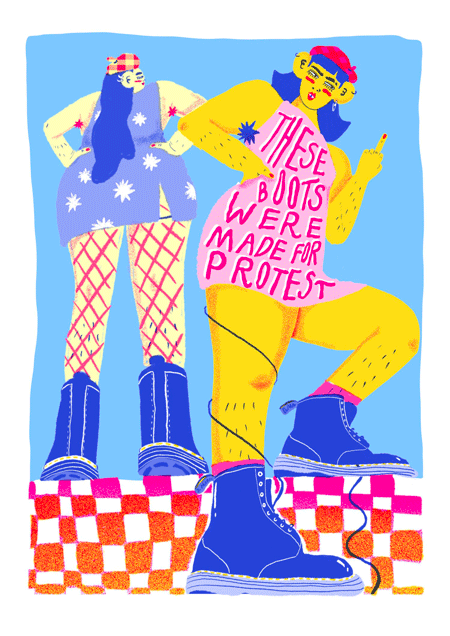 Granted that posters have been used for protesting throughout history, her lively colours and the characters she depicts have suitable political impact. She portrays people with all attributes (race, size, culture, hairiness—to name a few) in attempts to promote inclusivity.