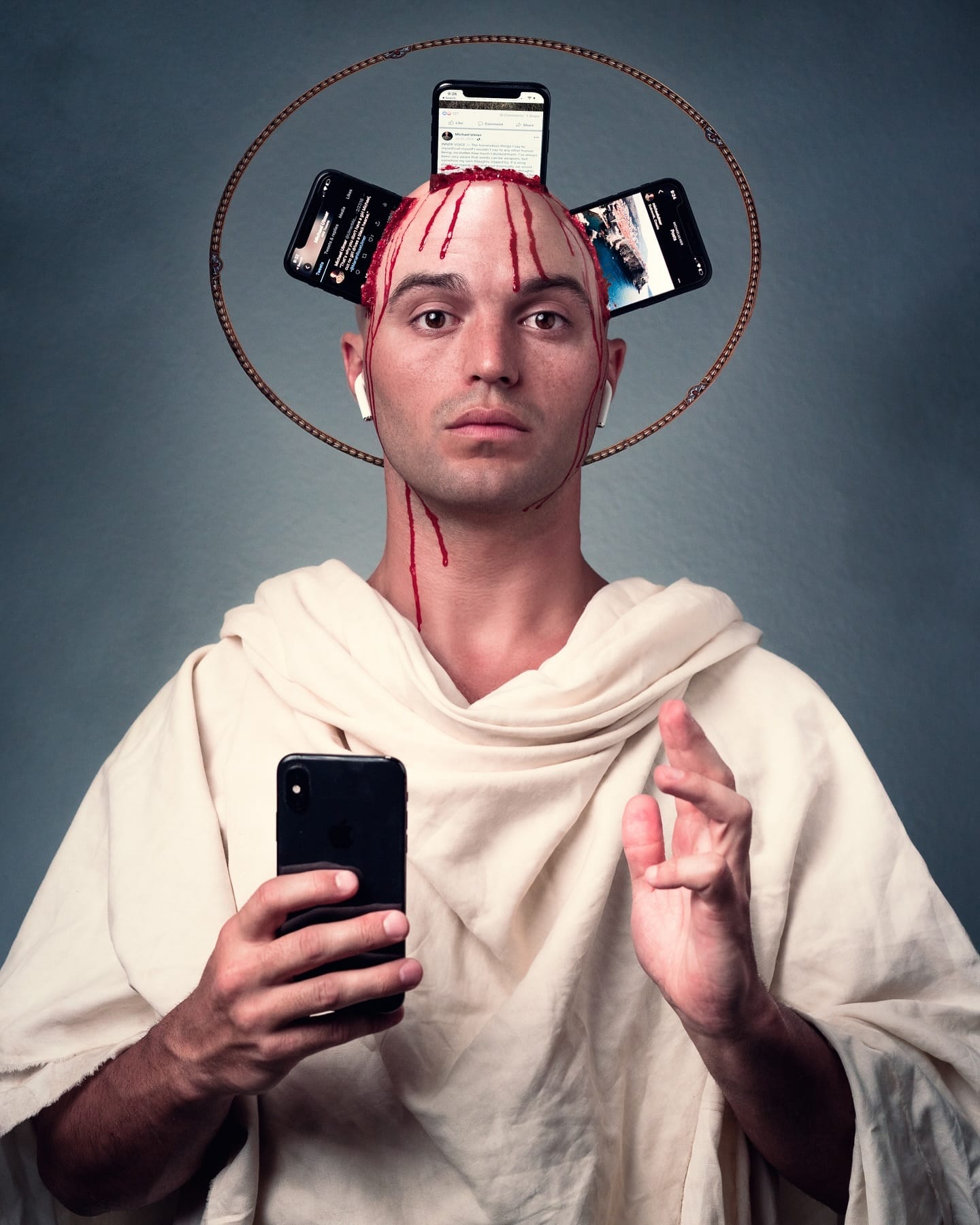 Photographer Michael Aaron Ulmer is known for his self-portrait and digital photo montages, during which he often discusses social and environmental issues. In Saint Anxius, Ulmer created his own version of the Salvator Mundi, a painting attributed to Leonardo da Vinci that features Jesus Christ giving his blessings with one hand and holding a glass orb with the other. In Ulmer’s version, he has put himself in Christ’s position, mimicking his pose as he gives his blessings with one hand and holds a cell phone with the other.