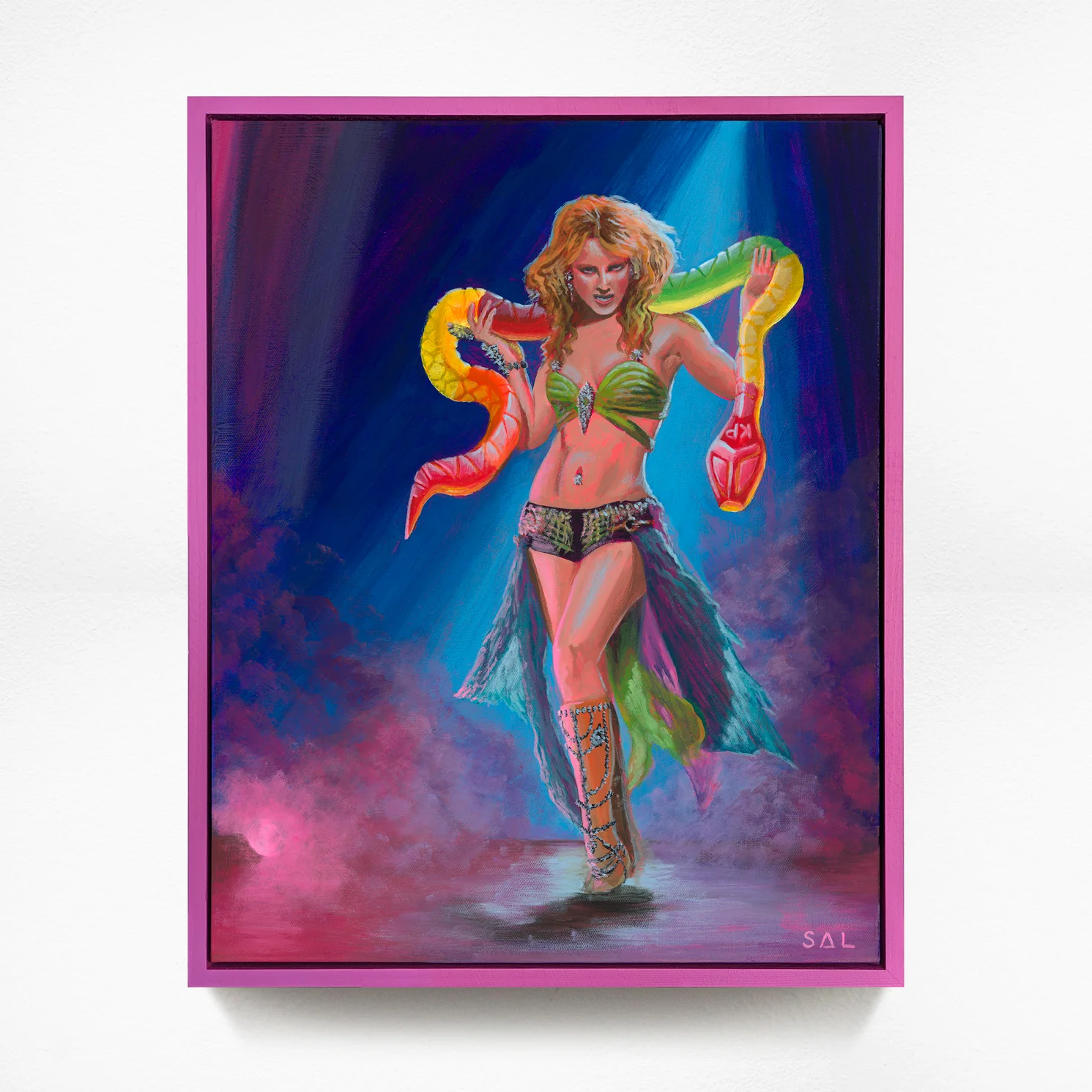 In her other paintings, such as Britney, Hastings has also used her gummy snakes to replace the iconic albino Burmese python that was part of Britney Spears’ 2001 VMA (MTV Video Music Awards) performance. Spears’ choreography involved draping the snake over her shoulders and showing it to stage-side audiences. She later recounted in her autobiography her fear of the choreography as the snake hissed at her several times during rehearsals and the performance itself, conveying its distress. This painting exposes how the snake was commodified and exploited for entertainment, calling for more ethical treatment in the future.
