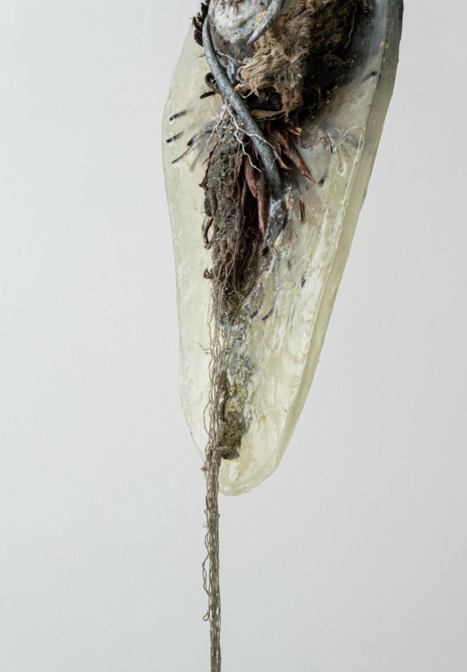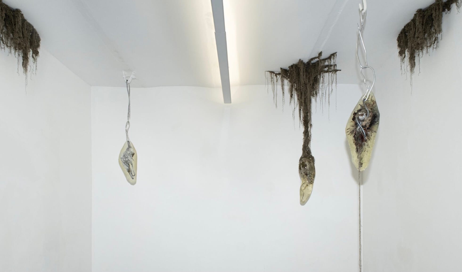 Serafini, Arborea and Bones and Flower are together a series of sculptures that hang from the ceiling by Italian visual artist B. Filippo Chilelli. These sculptures were made by following the posthuman philosophy, which seeks to decentralize power over the planet from human beings, allowing humanity to move forward while considering the needs of plants and animals alike as equals. They especially look towards Donna Haraway’s A Cyborg Manifesto, which presented a thought exercise to achieve posthumanism by imagining future human forms that have been assimilated with plants, animals and inorganic matter alike.