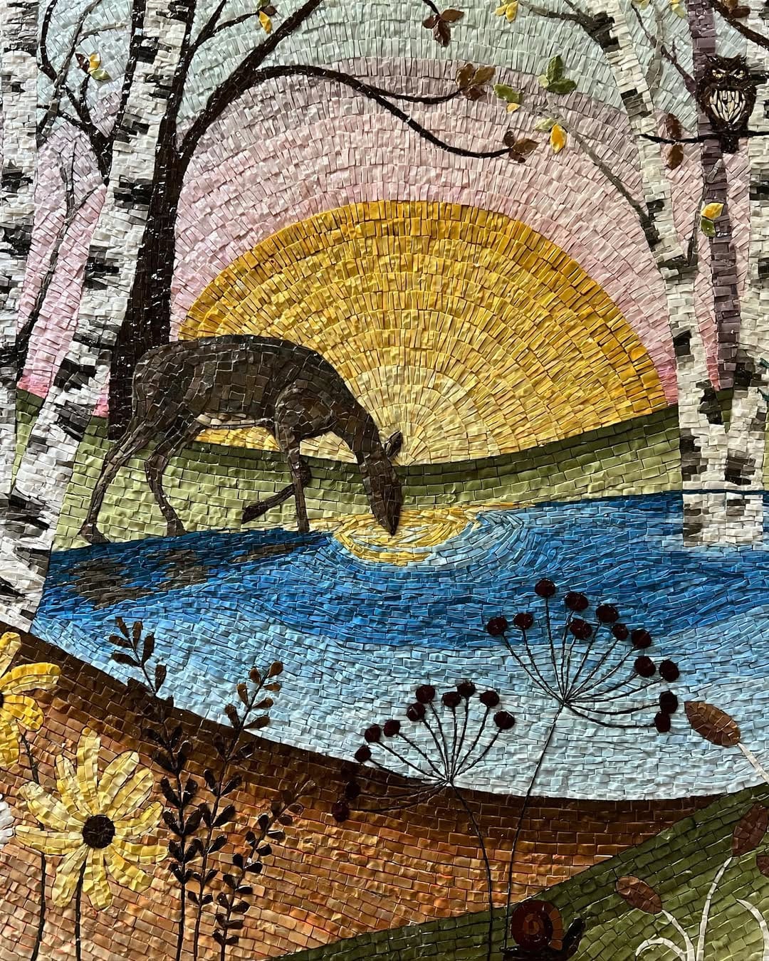 Minnesota-based artist Sharra Frank takes discarded ceramics, such as broken plates, tea cups and kettles and transforms them into ethereal mosaics of the animal kingdom. Each small ceramic piece can be inlaid with pieces from other ceramics to create owls, snails, deer and more. By doing so, Frank can use her mosaics to symbolize how a single species can contain multitudes, affecting its surroundings more than it meets the eye. This is why Frank’s mosaics are relevant to the United Nations Sustainable Development Goals of Life on Land and Responsible Consumption and Production.