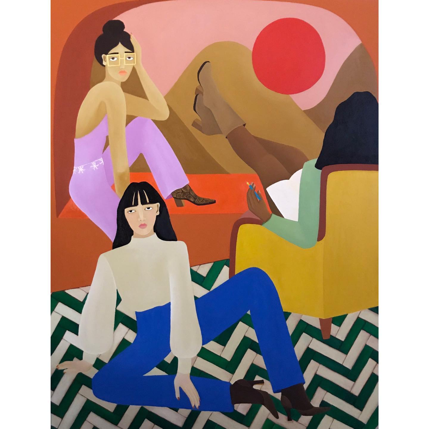 In her depictions of these diverse groups, Augereau always ensures to include authentic facial and bodily features that would be associated with their backgrounds. This means her paintings also help to challenge the Western and White centric beauty standards that exist worldwide. That aside, she always depicts these femmes relaxing and enjoying each other’s company, lounging together and chatting. Here, Augereau is highlighting another form of femme resistance: leisure.
