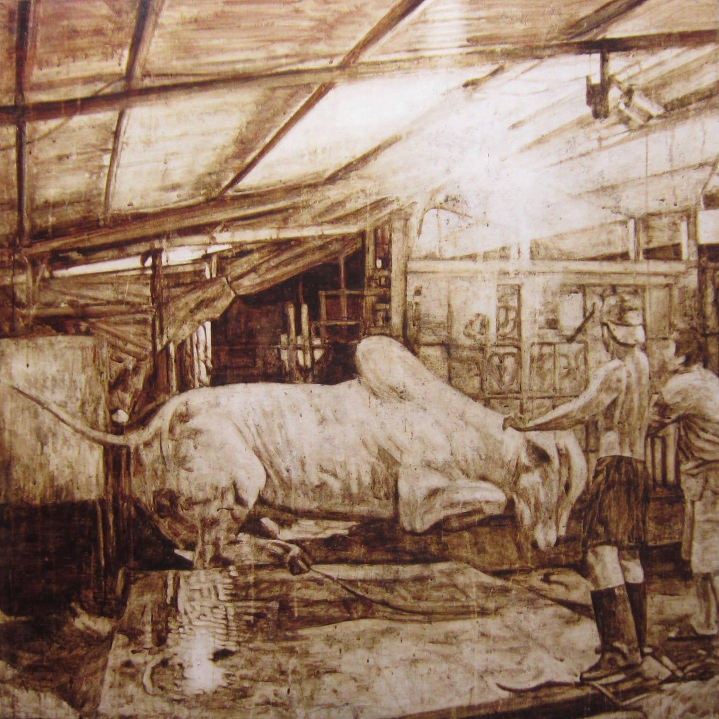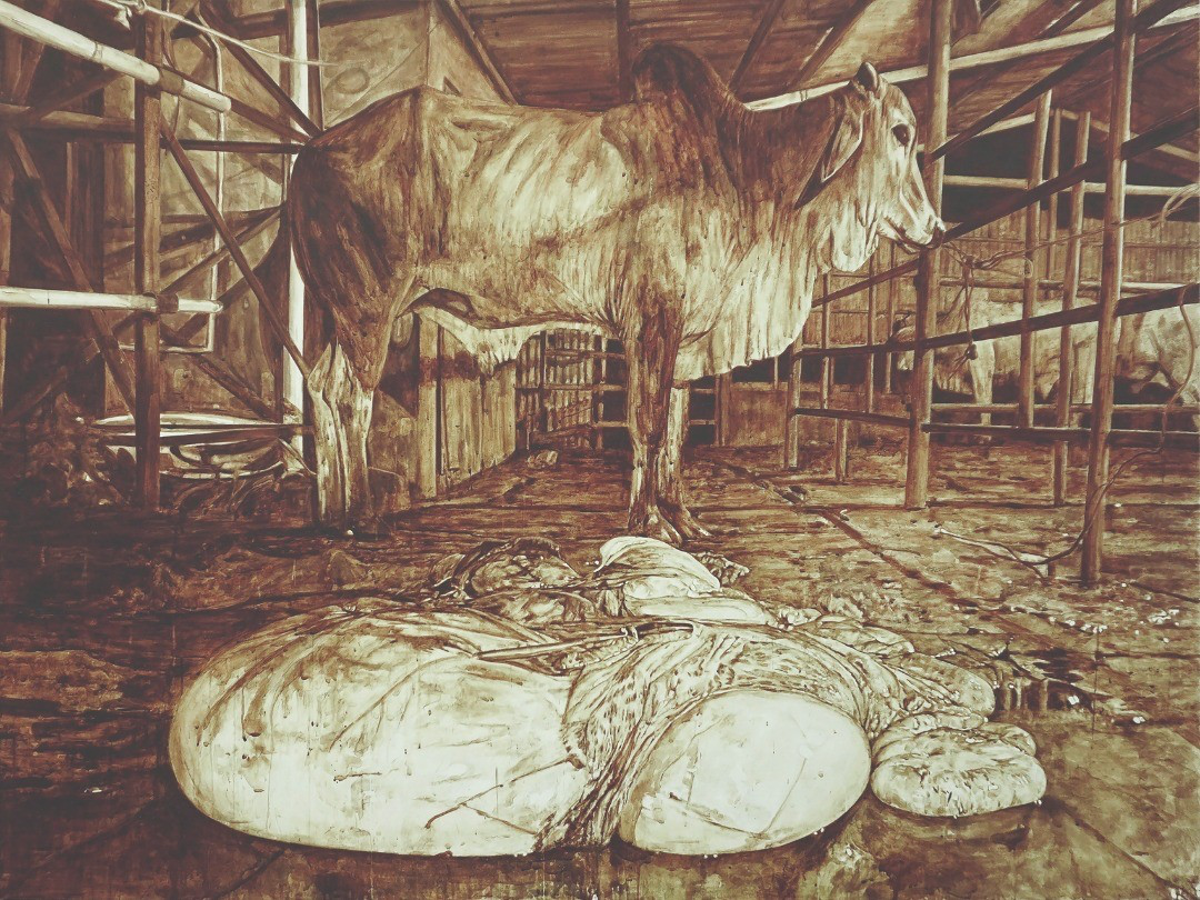 Despite being graphic, Đủ’s Slaughterhouse paintings do not show the actual acts of violence, but instead show its aftermath or moments just before any violent acts occur. Dried up cow’s blood, set with alum salt and golden varnish on canvas gives him some control of the shades of red that appear in paintings, allowing him to shade and depict light. As these paintings age, blood oxidizes and browns, which can already be seen in some of the paintings. This betrays the painting’s age, and how long it has been since the cow farm industry has seen any change for the better.