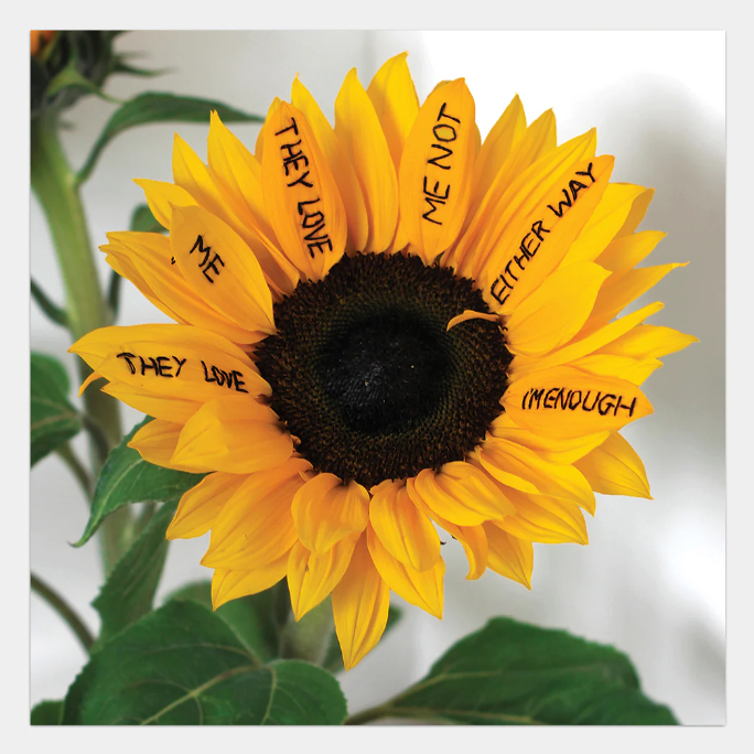 King soon decided to experiment with her work. She had her sights on embroidering on non-traditional mediums and found that flowers would make interesting canvases. Here, she’s alluding to how men would frequently gift flowers to women they are seeing. However, much like bouquets of flowers eventually wilt and die, King’s pieces remind women that, in dating, infatuation is just a fleeting emotion. This is exemplified in her piece THEY LOVE ME, THEY LOVE ME NOT, where she has embroidered the sentence “They love me, they love me not, either way, I’m enough,” onto the petals of a sunflower. The tongue-in-cheek piece reminds women that their self-worth is not determined by whether or not they are in a relationship.