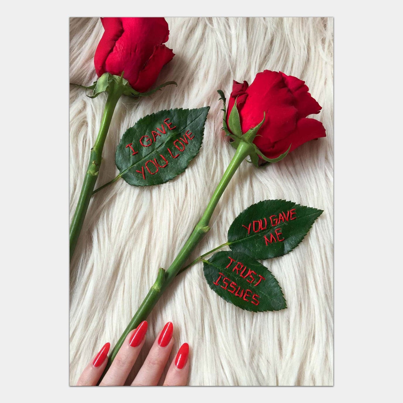 In certain other pieces, such as I GAVE YOU LOVE, which spells out “I gave you love, you gave me trust issues,” King is using a first-person point of view to seemingly share her own personal dating experiences. Pieces like this make her more relatable, showing that her embroidered dating advice comes from reliable first-hand experiences. As a woman navigating the contemporary dating scene herself, King’s work becomes a trustworthy feminist survival guide. Her work puts women first in a world that often places them last.