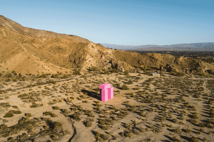 Dive-In (2019) is Superflex’s first large-scale artistic result from their ongoing project Deep Sea Minding. Installed for Desert X in Coachella Valley, the project looks towards a future dictated by the evolving consequences of climate change. Dive-In is an encounter across time, materials, and organisms. It imagines a future in which coastal cities are flooded and their lasting inhabitants are the fish. The installation establishes a meeting point between the present and a probable subaquatic future, operating as a drive-in cinema that will ultimately become a habitat for marine life. Previously, several types of structures were studied to classify the preferences of aquatic species. In particular, the pink hue attracted coral polyps and stimulated the flourishing of a new ecosystem. Scenes of fish engaging with prototypes of these structures are projected onto the pink coral walls, inviting human audiences to experience aquatic life personally while simultaneously incorporating the needs of the fish into the architecture as well.