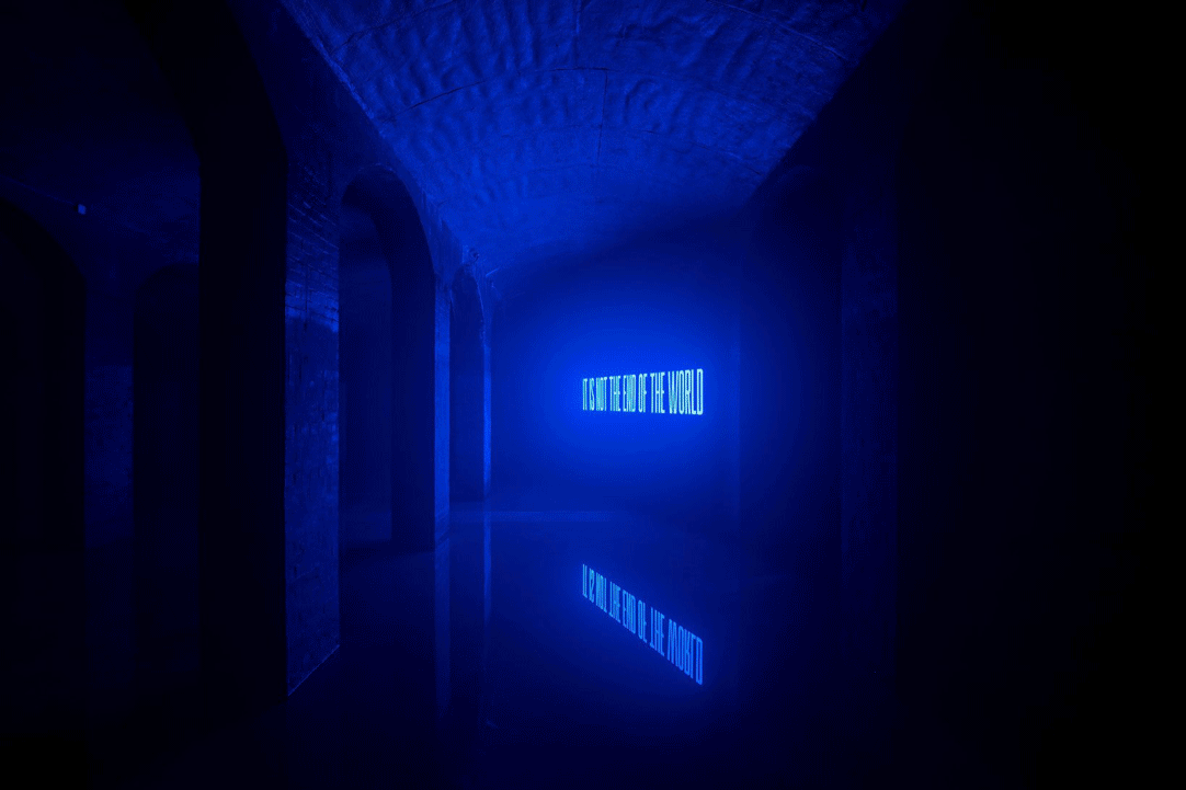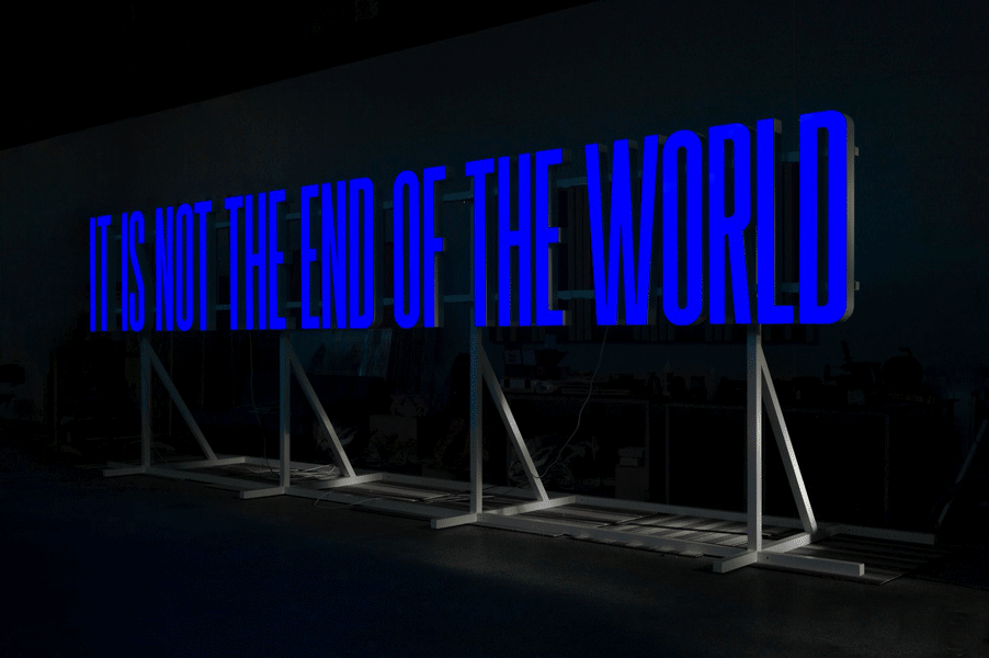 It Is Not The End of The World (2019) is a work by Superflex that presents the familiar phrase as an arrangement of LED lights while staging a time travel into an apocalyptic future. The sign invites audiences to reflect upon their present role in a world of accelerated climate change and an apocalyptic future to envision a world of vivid and complex life-forms. It allows visitors to transform themselves into archeologists and imagine a dystopian future. It Is Not The End of The World creates a multifaceted narrative of the end of mankind, suggesting that global changes might be the end of humanity but not necessarily the end of the world. Throughout history, Earth has demonstrated the potential to overcome devastation and reinvent life again and again, and it most certainly will do so in the post-human era.