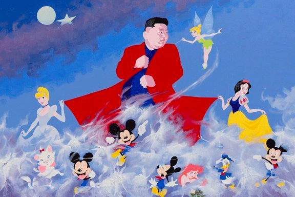 Since 1998, when escaping from North Korea as one of their top propaganda artists, Sun Mu (a pseudonym that means “the absence of borders”) continues to adopt the socialist realism techniques he learned during his time as an artist assigned to paint murals and propaganda posters. Though, recent artworks have a fundamental distinction. Realism is weaved with a sharp provocative tale, incorporating a political message against oppression.