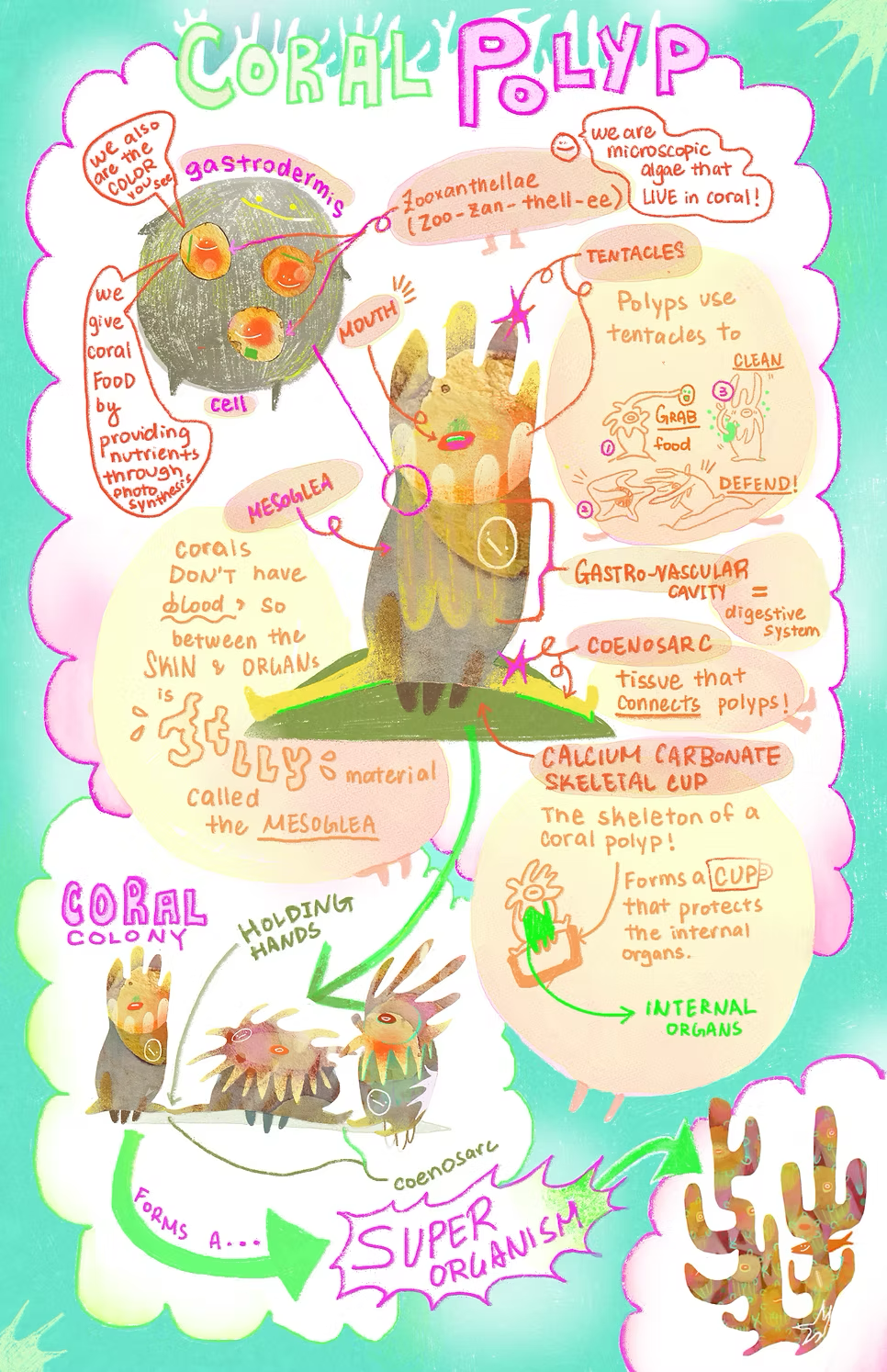 The CCC’s current project is playfully titled The Charismatic Coral Club and looks into the charming lives of corals underwater. This particular project sees her creating infographics that explain the lifecycle and physiology of vibrant yet elusive coral life. Ho anthropomorphizes corals, using the pareidolia effect to her advantage by making the corals appear to have human-like arms, legs and faces that allow them to share their stories in easy-to-understand language that appeals to all ages. “We have mouths to eat the food we catch,” says one coral, “we have tentacles to catch food, and 'hands' called COENOSARCs that hold us together,” says another. “We hold hands like this!” they proclaim together.