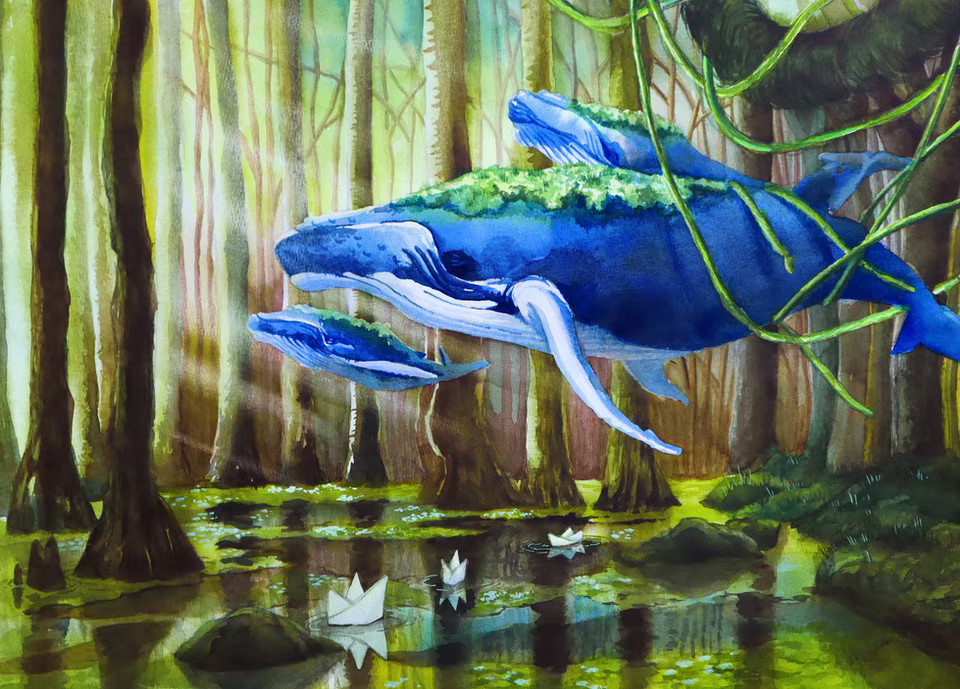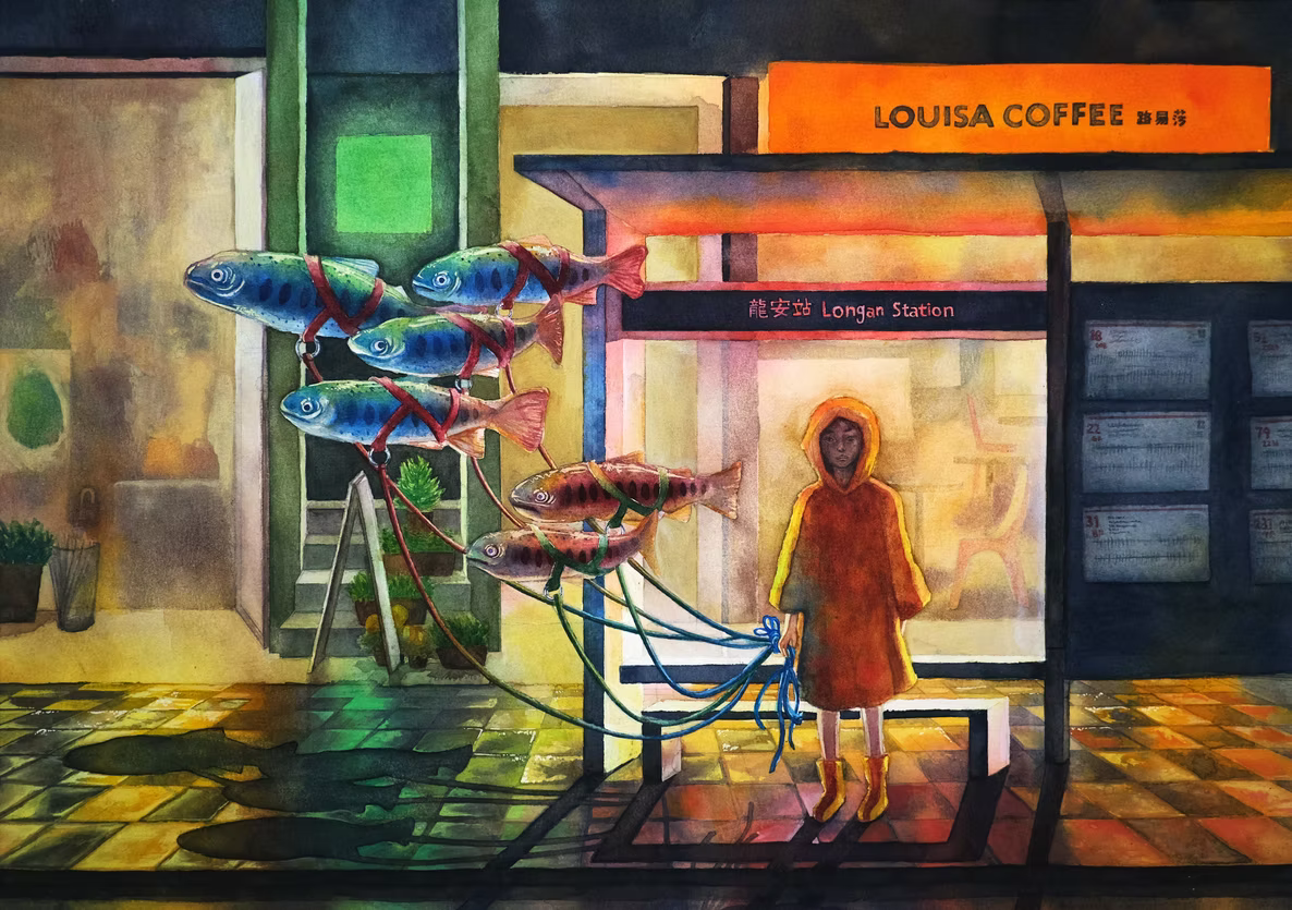 Aside from infographics and creative character designs, Ho also creates illustrations that further aid people in their quest to empathize with wildlife. One such project is The Riverine Awareness Project, a series of four watercolour pieces that bridge her personal experiences with the animals and naturally occurring phenomena in the world’s river ecosystems, connecting them as easy-to-understand symbolism and metaphors. For example, her piece And Home is Downstream uses her childhood—one spent moving from place to place with no real sense of home—to reflect on how river trout are equally as lost. They are a migratory species that has had their need to swim upstream to their home rivers or natal streams for survival and reproduction severely impacted by environmental stressors and human-made physical barriers.