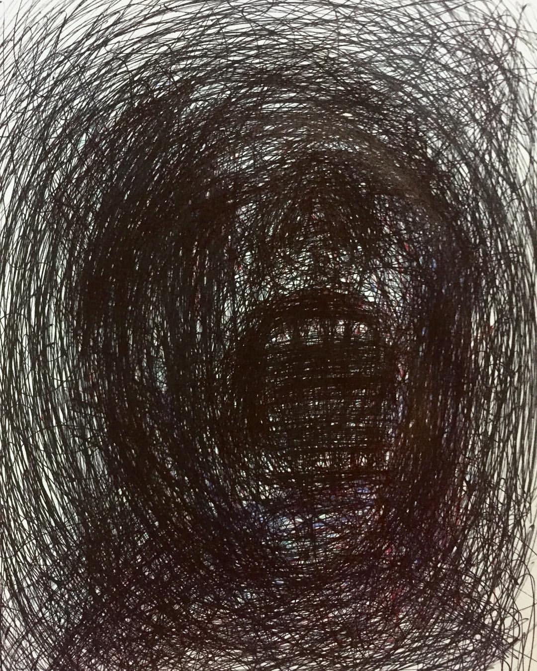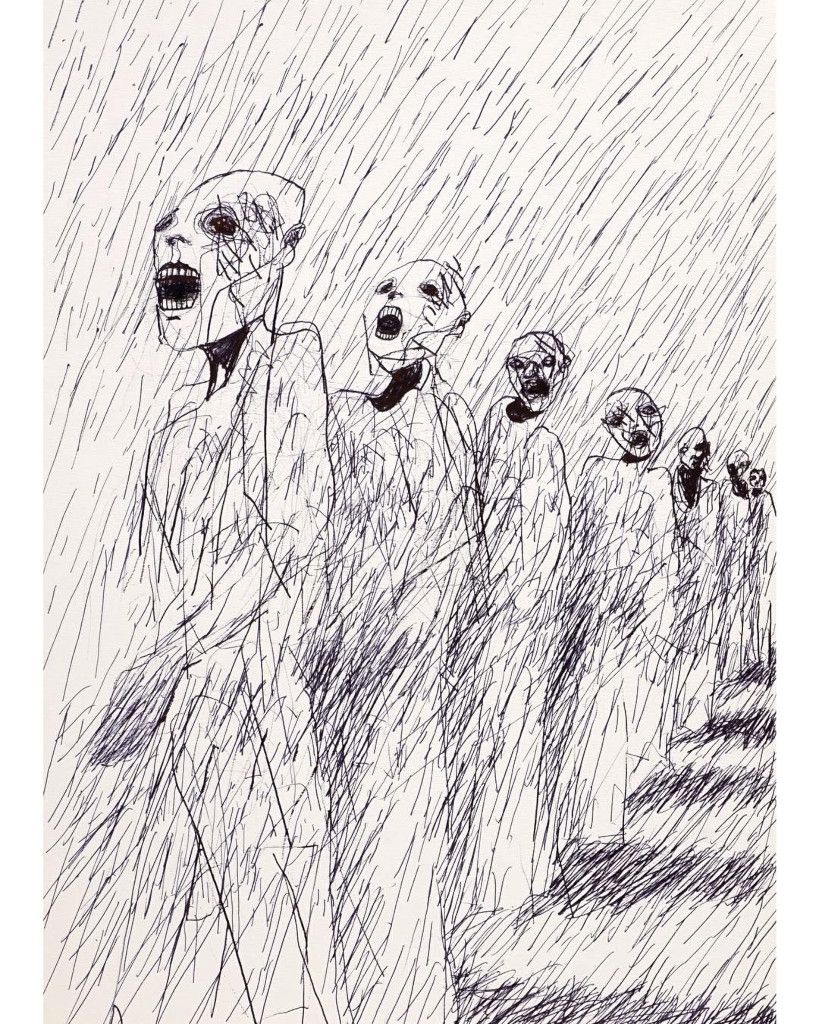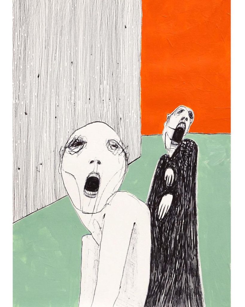 Naji Chalhoub is best known for his emotive, scribbled line drawings of seemingly torturous subjects whose hollowed-out eyes, sinister smiles and gaping screams unsettle the viewer. Based out of Lebanon, Chalhoub’s manic penmanship dominates the landscape, where the artist transforms his abstracted lines into gaunt, emaciated and distorted figures. Viewers can find solace in Chalhoub’s work, as the embedded despair and terror creates a cathartic experience for the spectator relating their own experiences to Chalhoub’s emotional forms. His series The Mouth of Madness attests to the psychological dimension captured in his works, in which his blank ink with the occasional inclusion of sparse red lines mark feelings of depression, anxiety and fear.