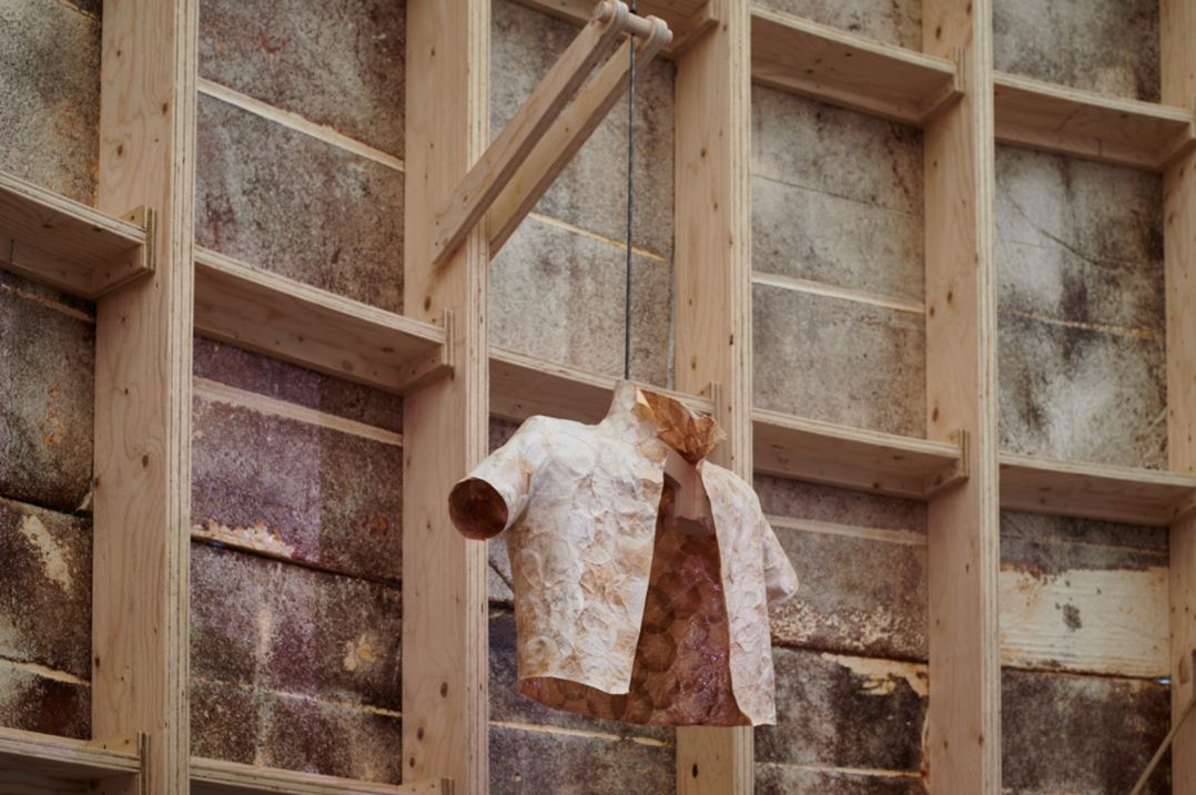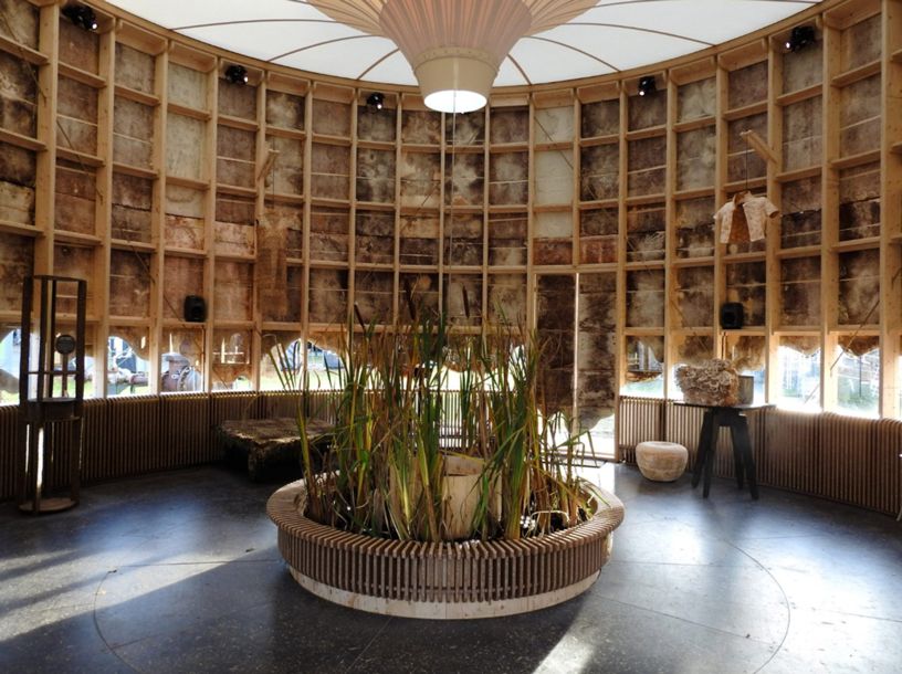 Around the Pavillion, benches were created by Atelier NL from trees that fell during a storm in Eindhoven earlier that year, demonstrating functionality by giving viewers a place to sit in an ecological manner. The inside of the Pavilion houses furniture and clothing made by designers introducing materials, such horse-manure based manureality by Martijn Straatman and Living Skin by Aniela Hoitink, made from mycelium, kombucha and algae.