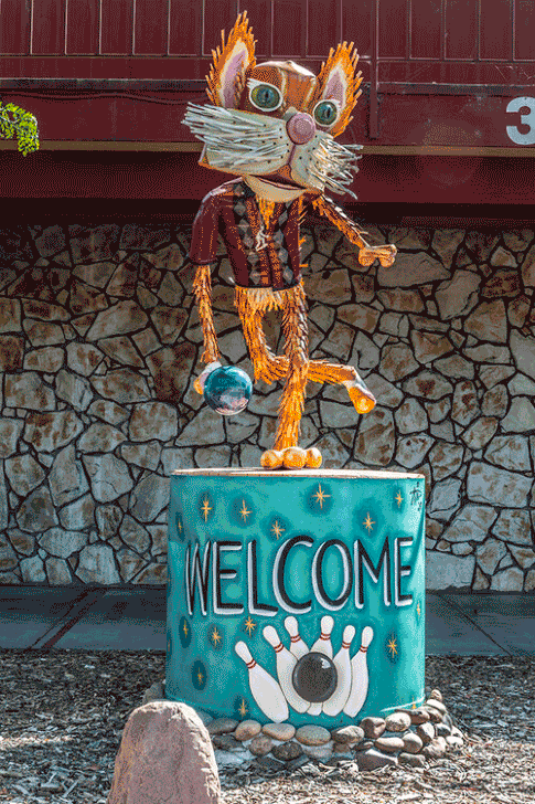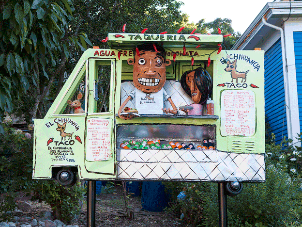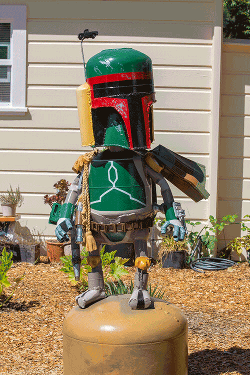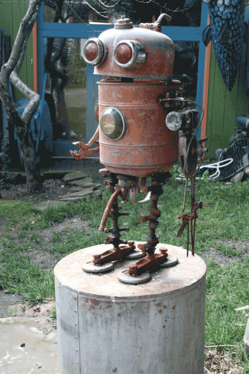 Early in his career, Amiot resided in Toronto as a ceramicist, primarily working with clay. His accidentally-discovered passion for junk art pulled him towards California, where materials are abundant. After settling down in Sebastopol with his family, Amiot ran free with creativity, producing impressively large and incredibly personable sculptures painted by Laurent. Their front lawn was covered in new creations, a strange image in such an ordinary town.