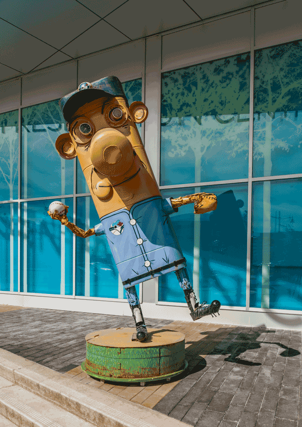 What truly breathes life into this sea of eclectic characters is the natural motion of the Carousel and Amiot’s ability to form metal sculptures that float by onlookers as if they were weightless, unencumbered by the burden of representing Canada. Each piece is playful, visually strange and surprising, and each turn of the Carousel means to delight viewers. Standing in one spot, viewers watch the images fly by as if they were in a cinema, the exaggerated features of these sculptures drawing eyes from one point to the next. Every sculpture is meant to play a temporary part in a greater performance, complementing each other, posing contrasts visually and ideologically, but coming together to articulate the singular identity of Canada. Observing the Carousel’s movements is just as enriching as participating in its parade, both an aesthetic blur of motion and colour. The actual concept of the Carousel is ingenious–viewers watch as the concept of Canada unfolds before their eyes, grabbing their attention with quirky details in each piece. It’s a feast for the eyes, the perfect attention-grabbing structure for Downtown Markham, which, similar to the Carousel, unfolded to reveal the wonders and innovation of Canada.