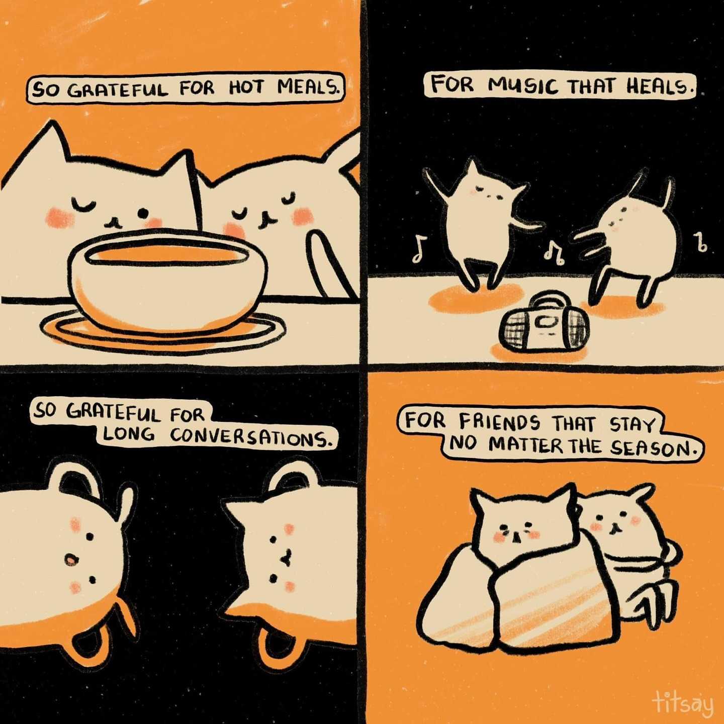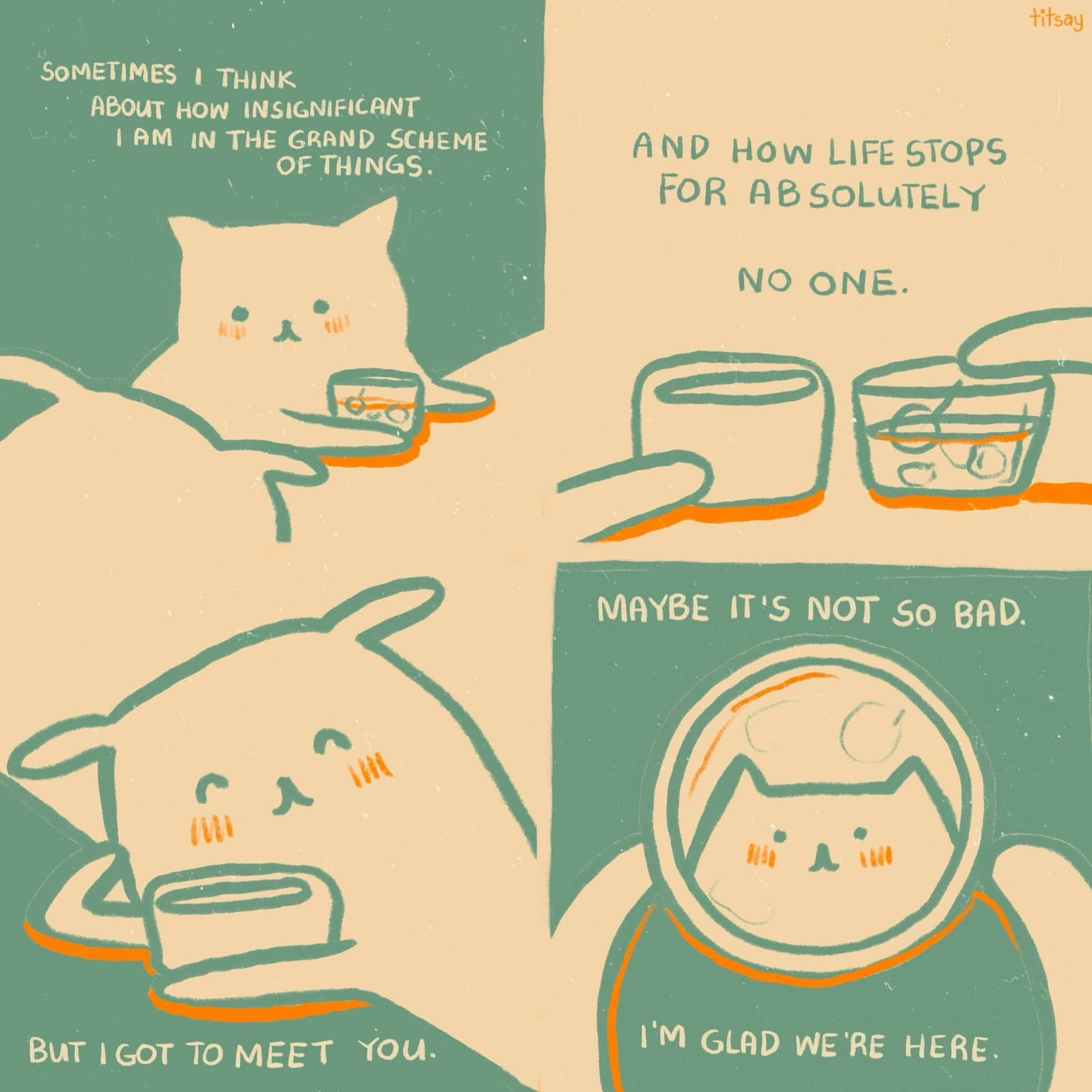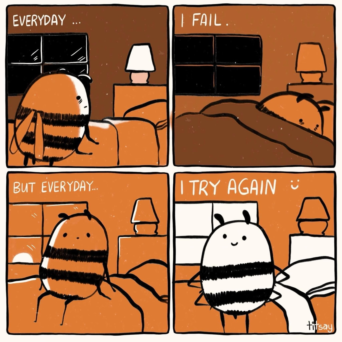 Artist Titsay creates online blurbs of comic strips of different cute and affectionate animals. Each strip delivers an encouraging message, giving people the strength to try again another day and to be grateful for the little things in life. Titsay also shares these comics every other day on her social media platforms, which has attracted over 650,000 followers on Instagram.