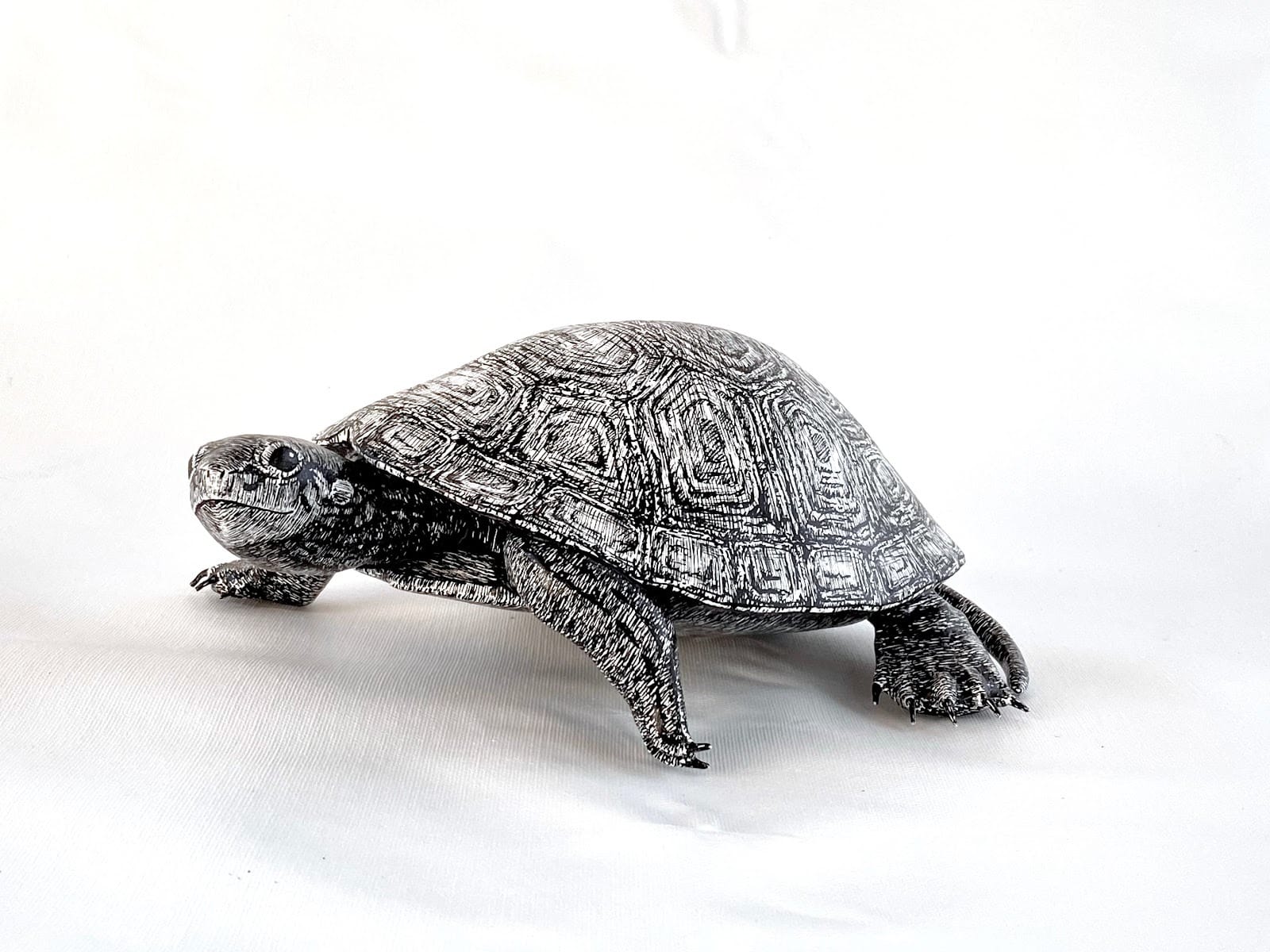 In creating his pieces, Murayama begins by first trying to adopt an animal’s point of view. For example, he would begin a piece that depicts a tortoise in nature by first going out to nature and crouching, putting himself at a tortoise’s height to witness firsthand how a tortoise sees the world.