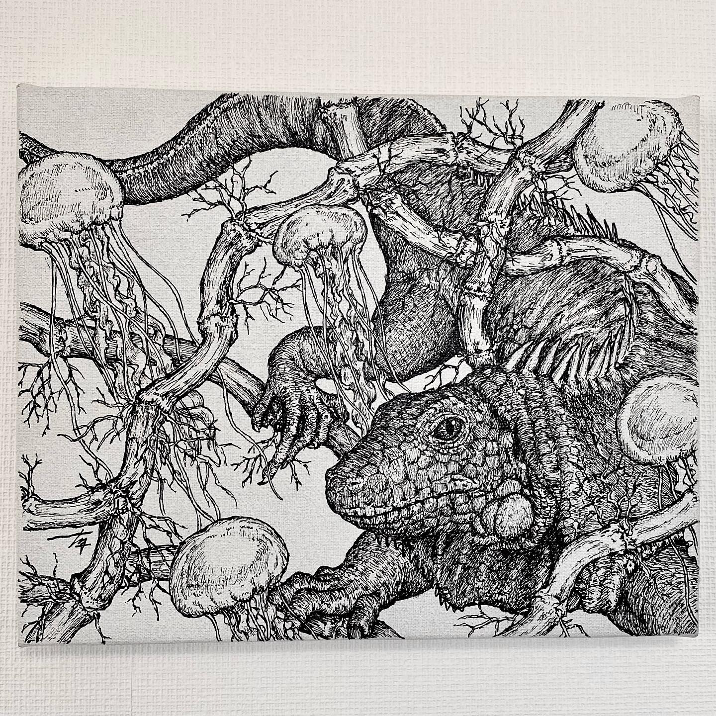 As an example, his piece Iguana shows an iguana floating amongst a shoal of jellyfish. By depicting these species together in his signature pen on paper drawings, Murayama not only show human kind’s connection with nature, but also highlights how different species exist as complementary components of a planetary ecosystem, despite the fact that they are not found in a single space together. Each species has a role to play in the grander scheme of things, a cycle that keeps the planet hospitable for humankind and all the wonderful creatures they share it with.
