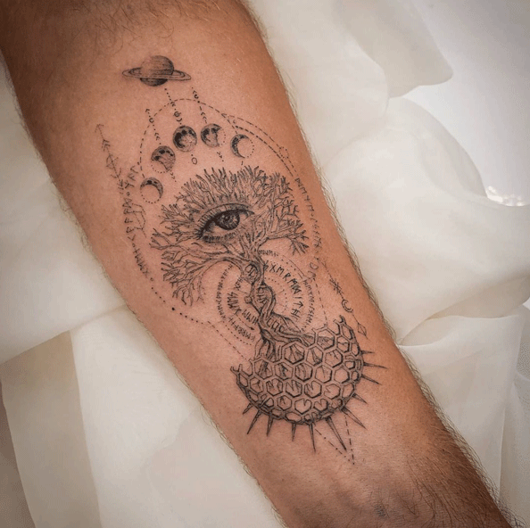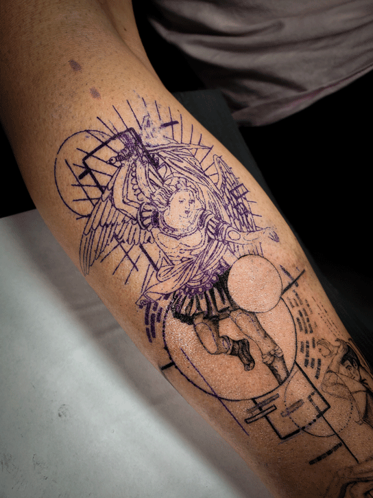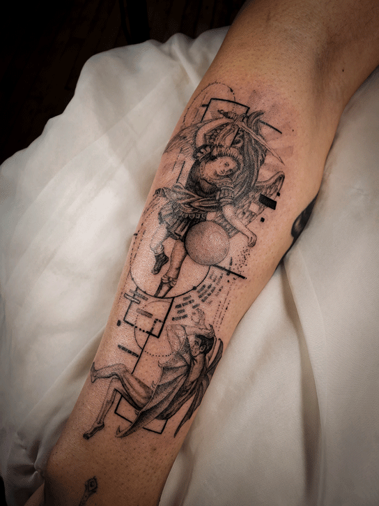 I also use a lot of circular and geometric designs in my art because I don't want the pieces just to float around. I want to ground it, give it foreground and background. This adds more to the story that's there already. I personally try to create a story behind each piece and figure out the reason why they got a tattoo. From that, all the shapes relate to their reasoning.